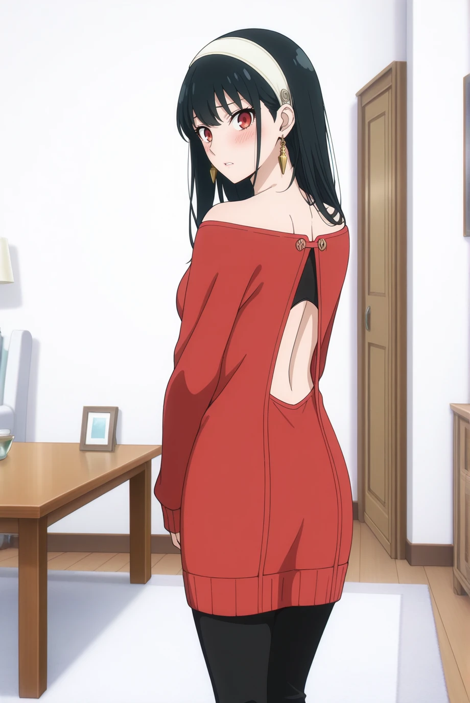 outfit_2, bare shoulders, collarbone, red sweater, sweater dress, long sleeves, sleeves past wrists, off-shoulder sweater, black leggings, high heel boots, ankle boots, brown footwear, back cutout, back,
