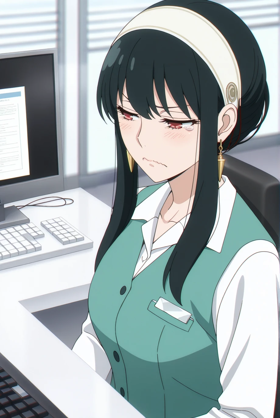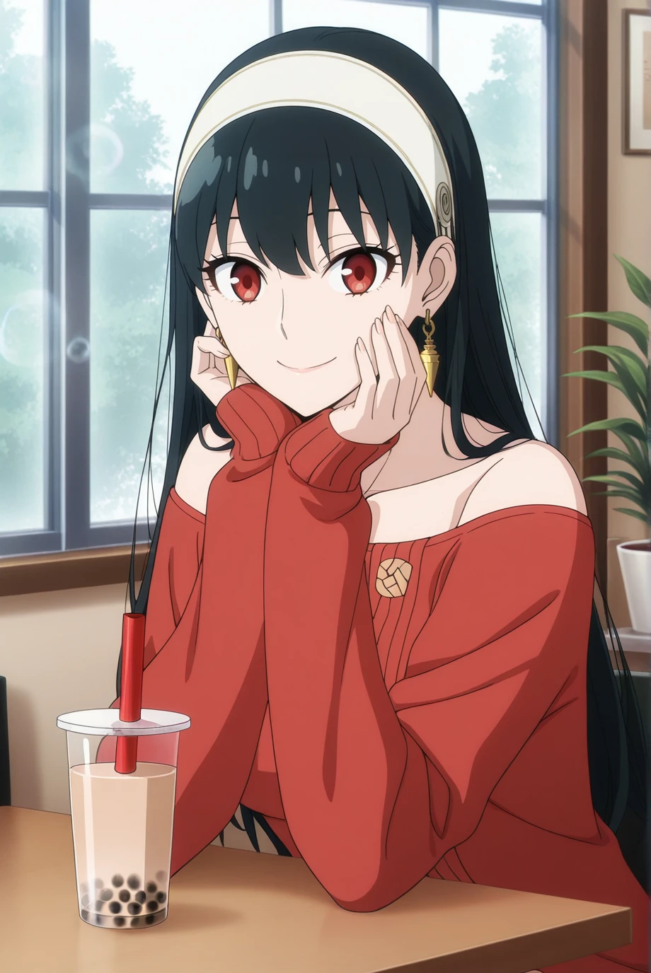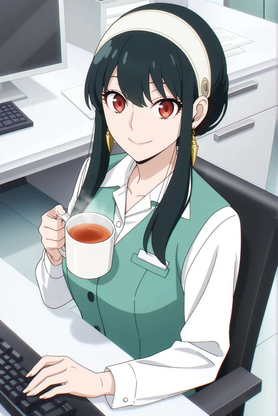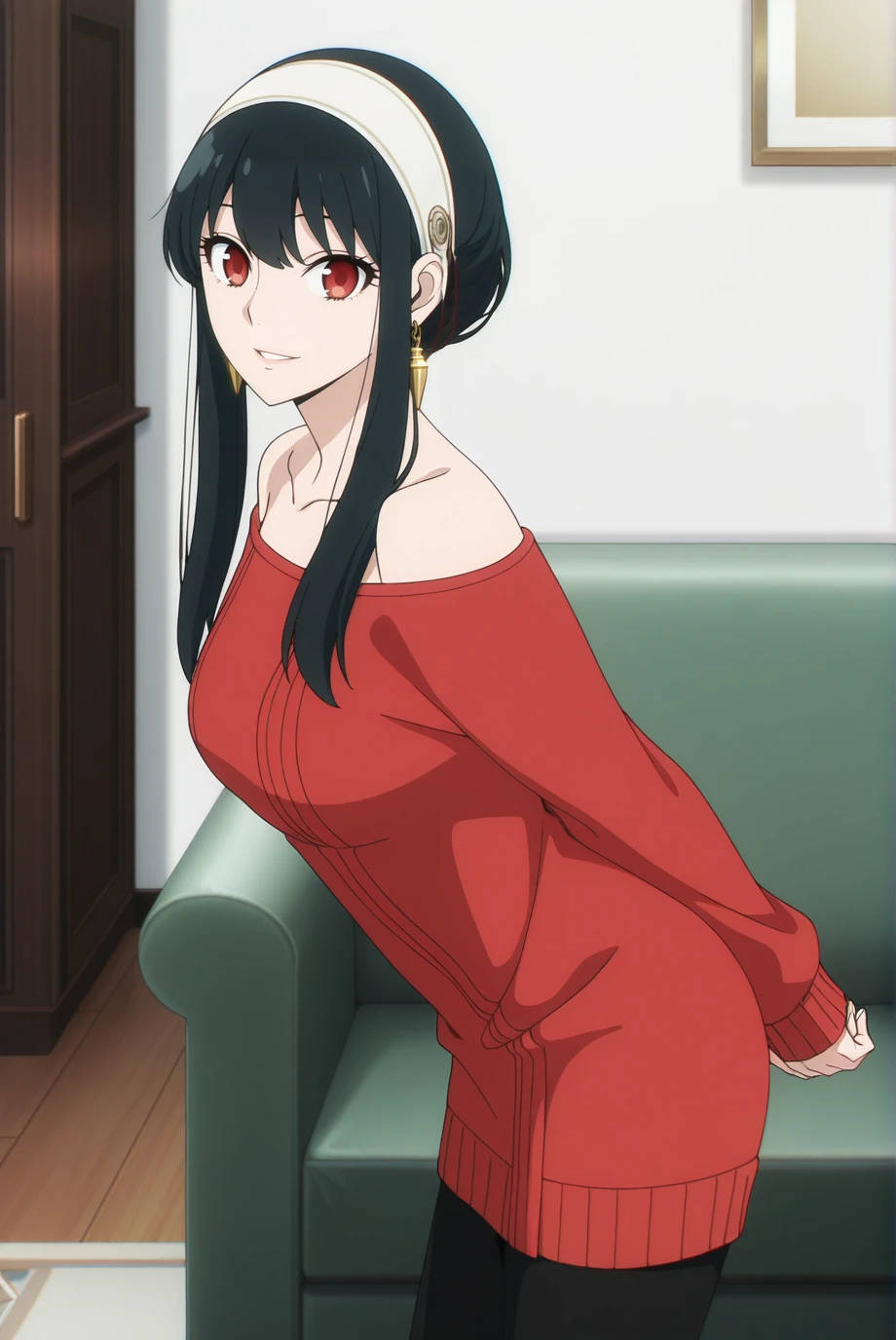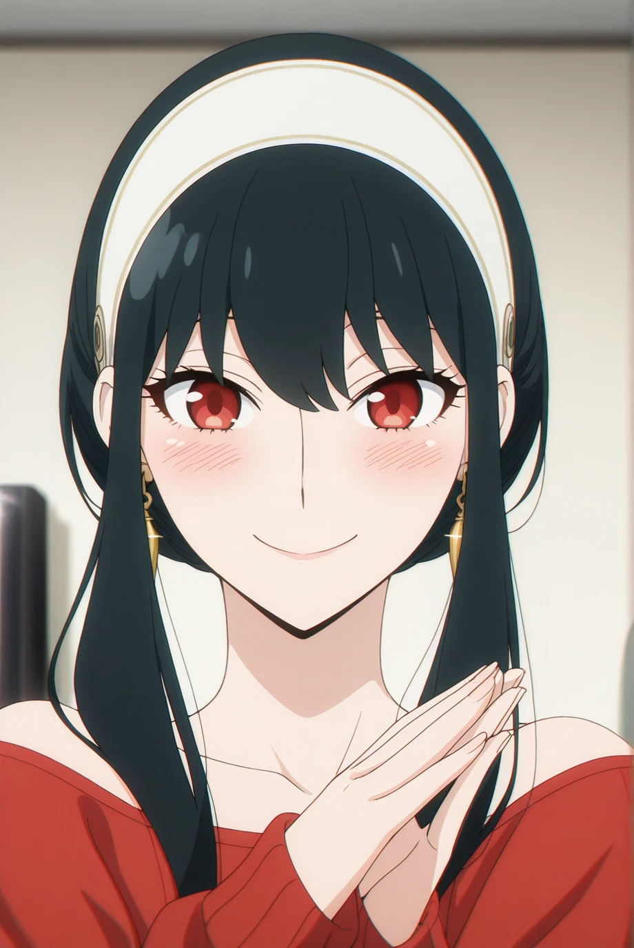 <lora:YorForger-IL-v1-08:0.9>, ChopioYor, black hair, red eyes, gold earrings, looking at viewer, anime coloring,