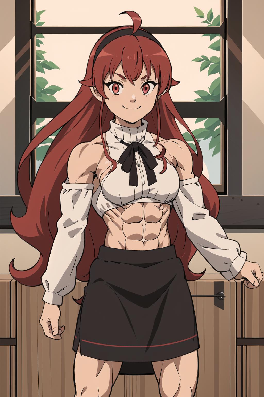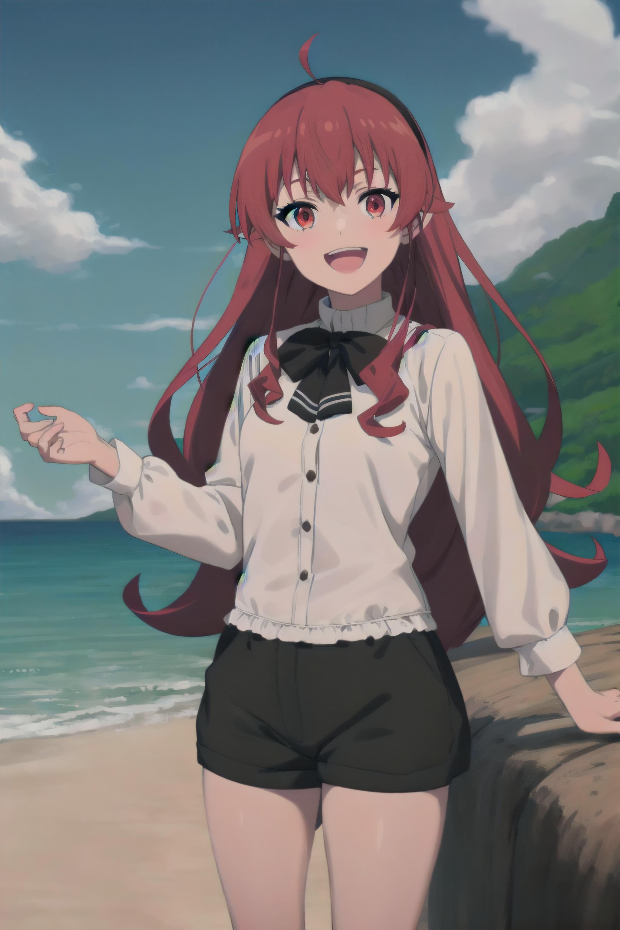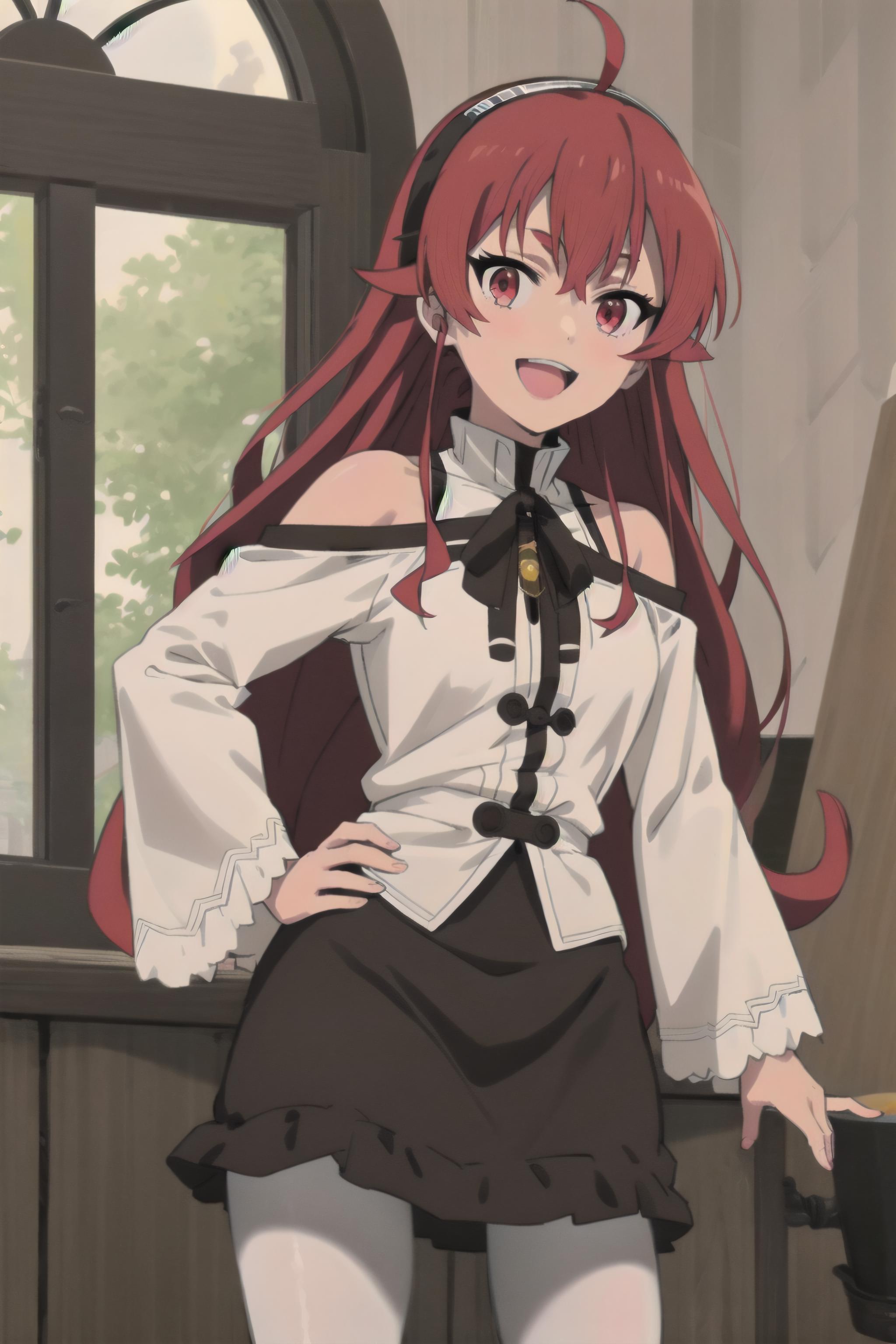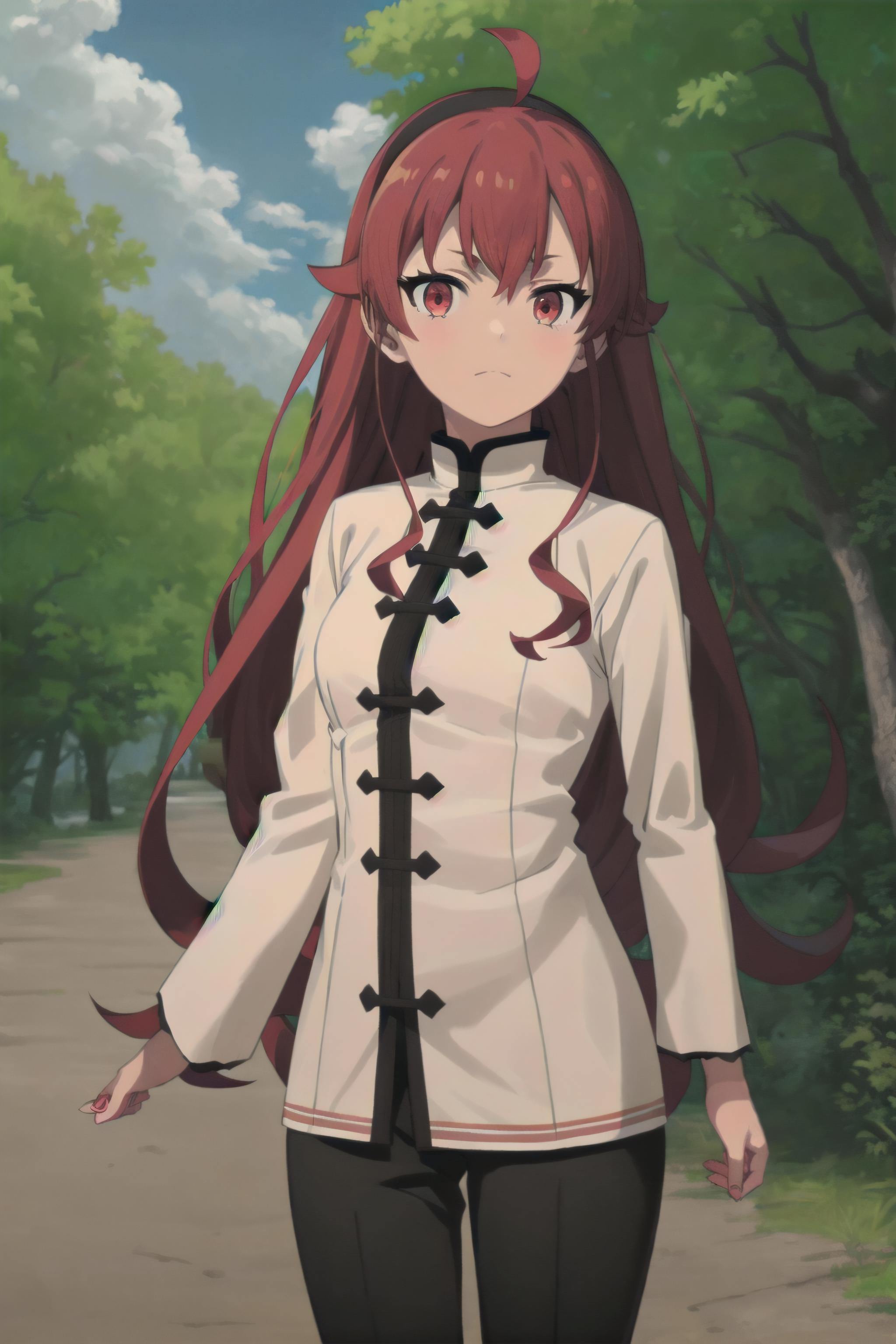 long hair, red hair, ahoge, red eyes