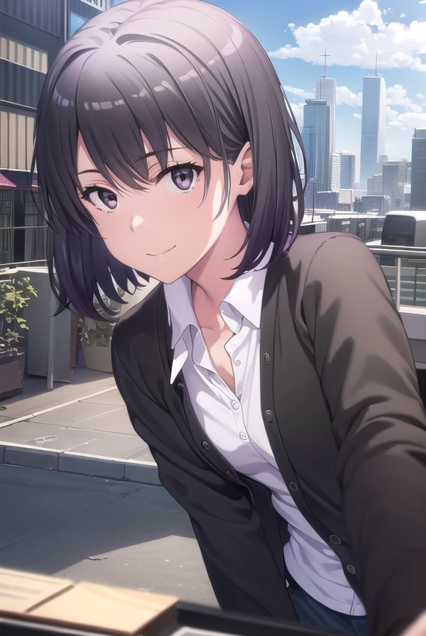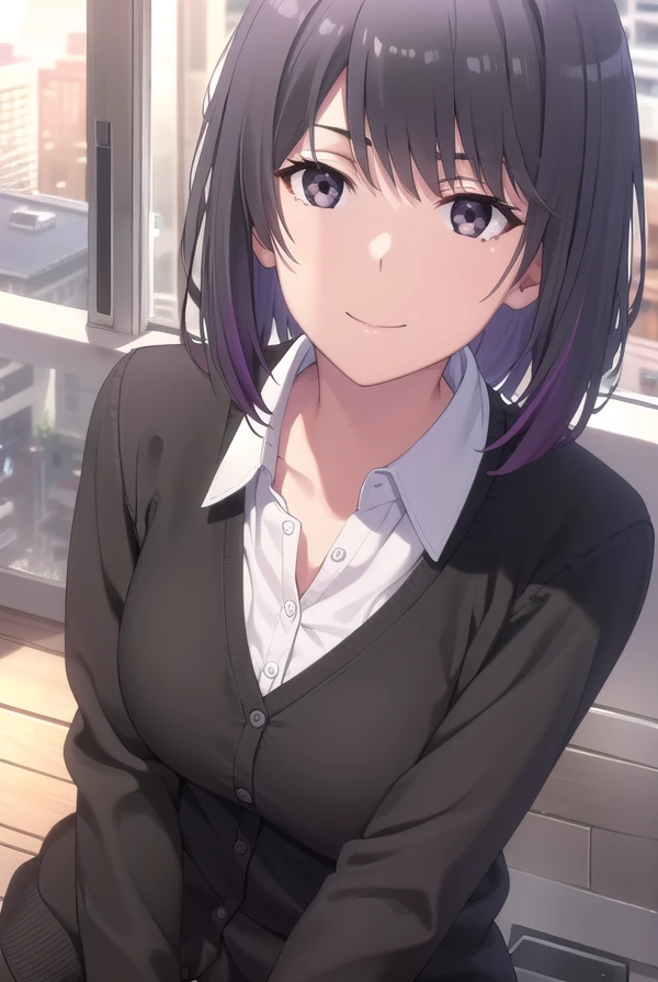 haruno yukinoshita, short hair, hair between eyes, (black eyes:1.5), black hair, gradient hair, two-tone hair,