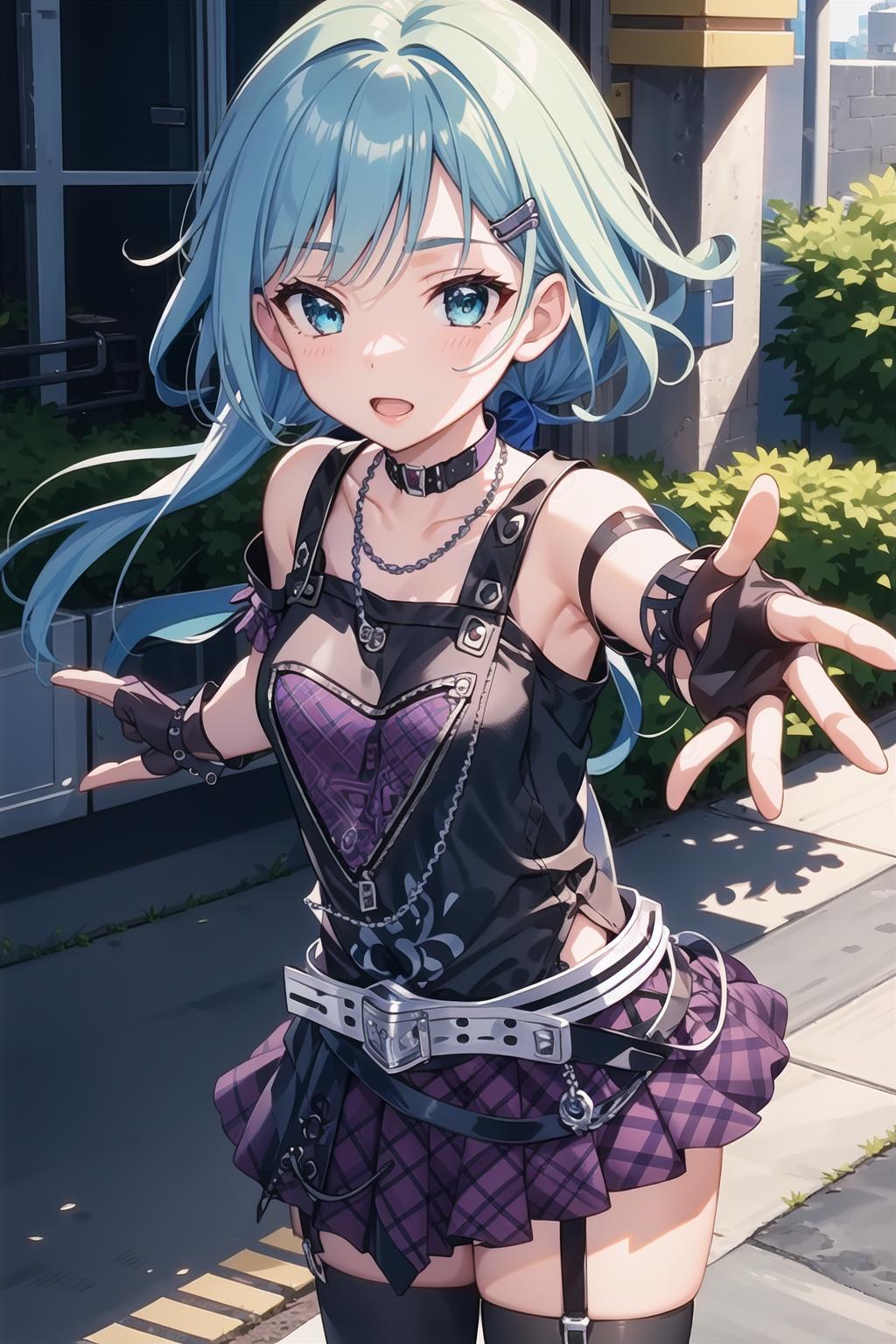 ninomiya_asuka_cos ,gloves,bare shoulders, collarbone, pleated skirt, choker,striped, belt, miniskirt, fingerless gloves,bracelet, black shirt,chain, garter straps,plaid skirt,striped thighhighs,purple skirt,zettai ryouiki,