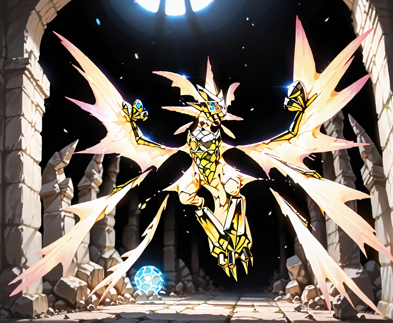 And now for the main event: The light that burns the Sky, Ultra Necrozma. Having by far the largest dataset, this one should be the most versatile. The AI does seem to have a hard time understanding what's going on with the wings, but nothing a little bit of prompting can't fix. It also does have a tendency to be VERY bright since most images of Ultra Necrozma have it with an absurd amount of light coming off it, again fixed with prompting. For anthros, I recommend setting the lora to 0.8-0.7. The activation tags are "NecroU" and "Ultra Necrozma," naturally.