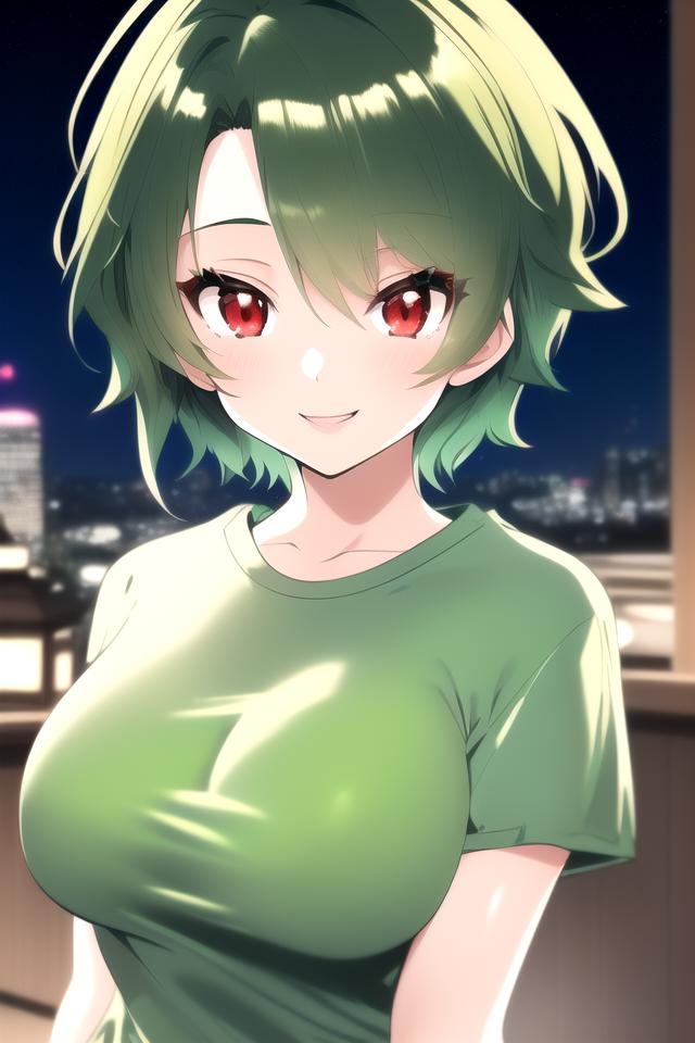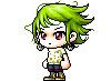 She always wears apple green tops and blue jeans. The length and thickness of these clothes change with the seasons. She also particularly likes apple and skull-shaped accessories and asymmetric shapes. In order to match her title "Green of Seven primary colors", and dyed his brown hair green.
