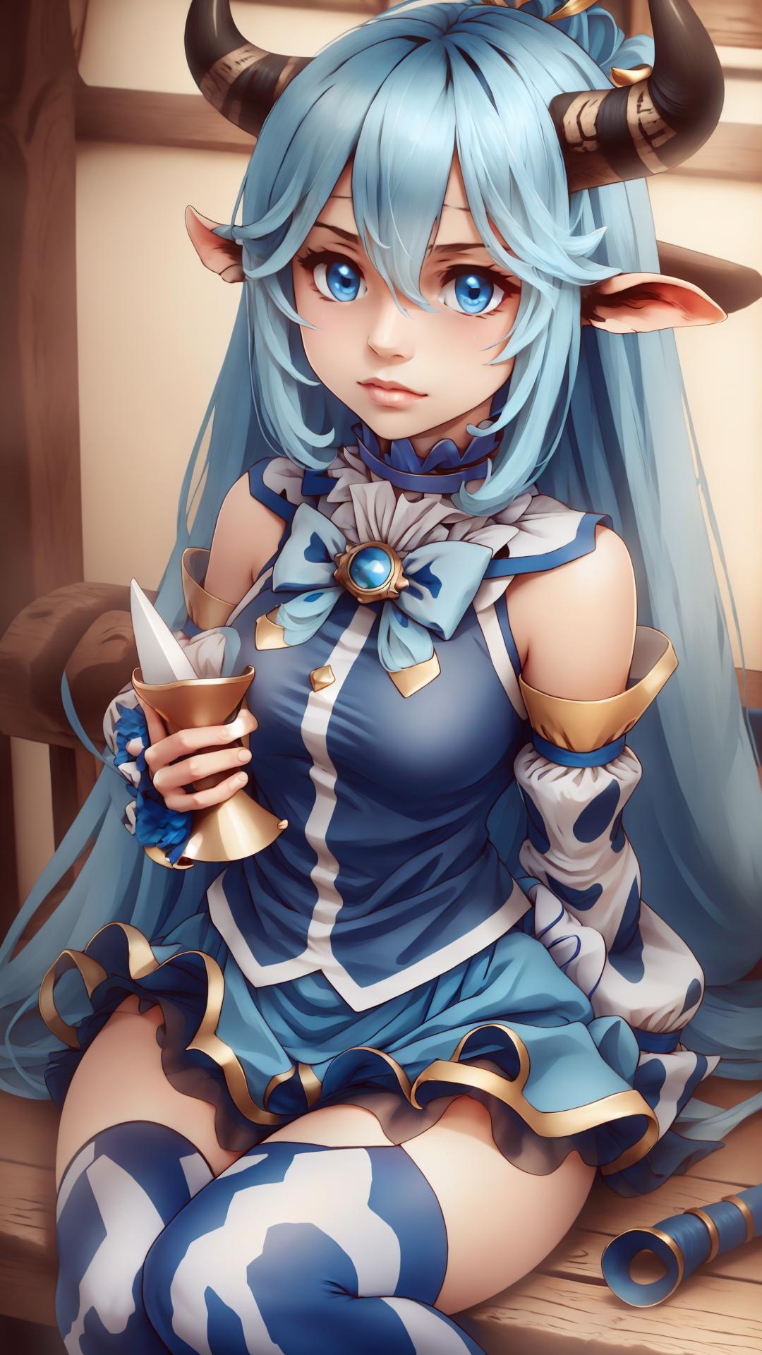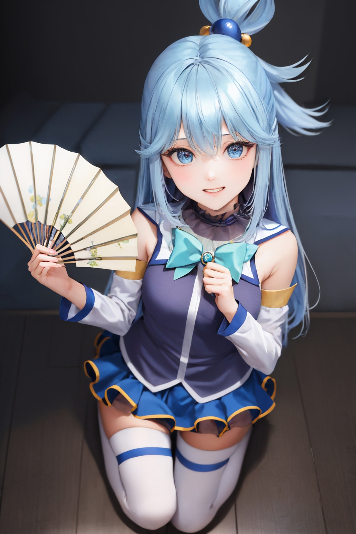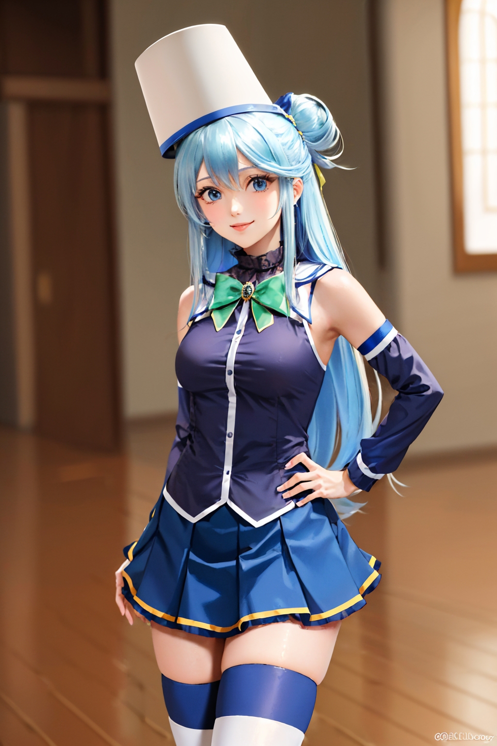 Default Outfit: blue shirt, bow, detached sleeves, skirt, thighhighs, ???? shoulders