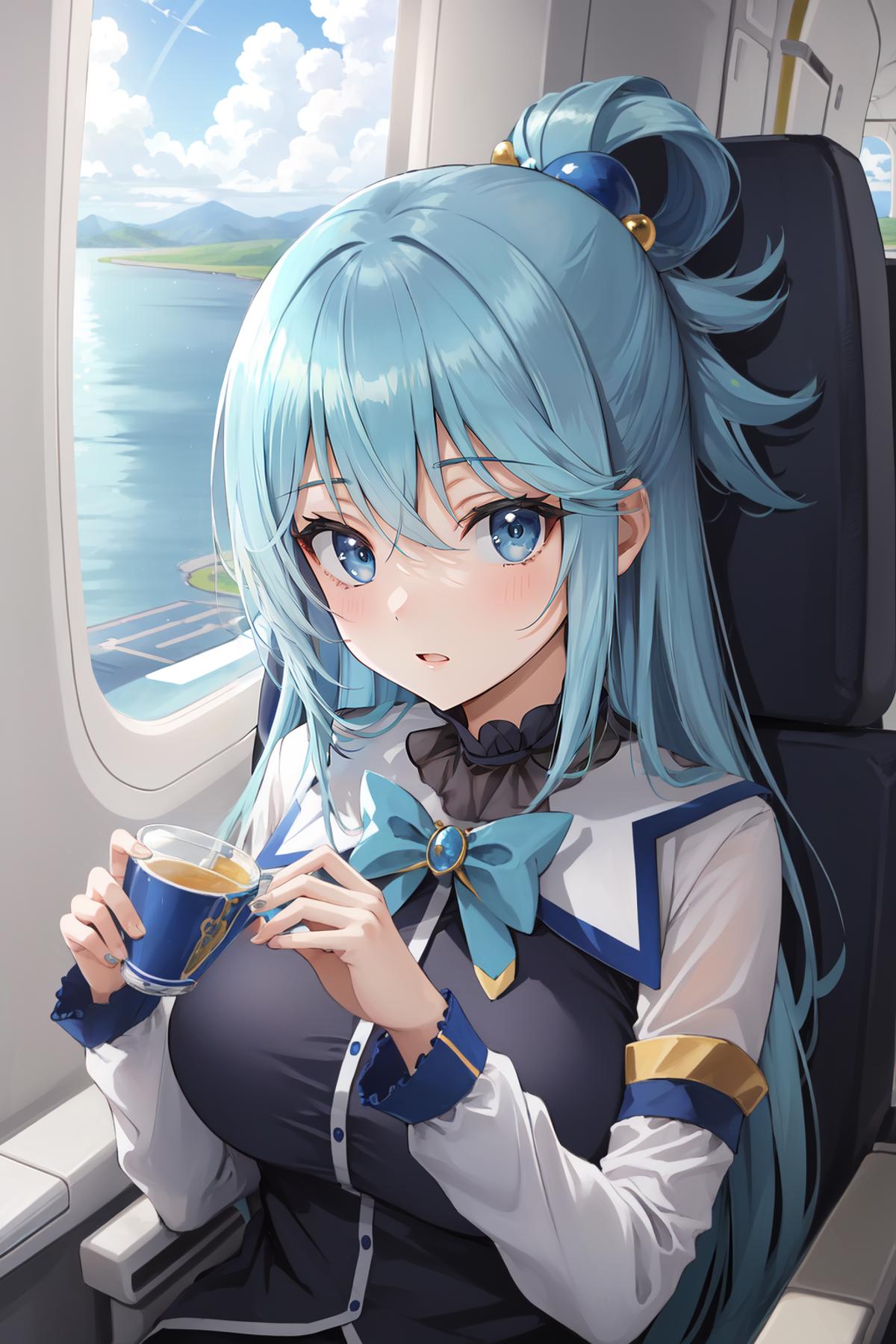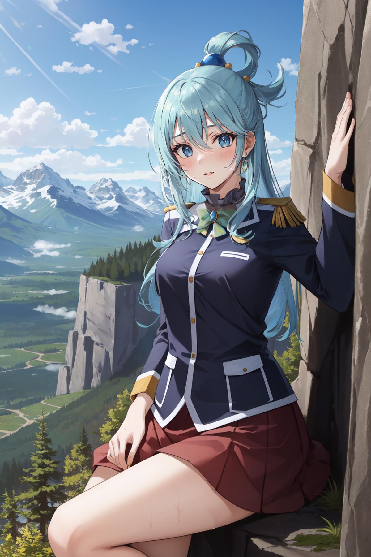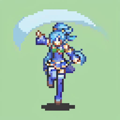 Default Outfit: blue shirt, bow, detached sleeves, skirt, thighhighs, ???? shoulders