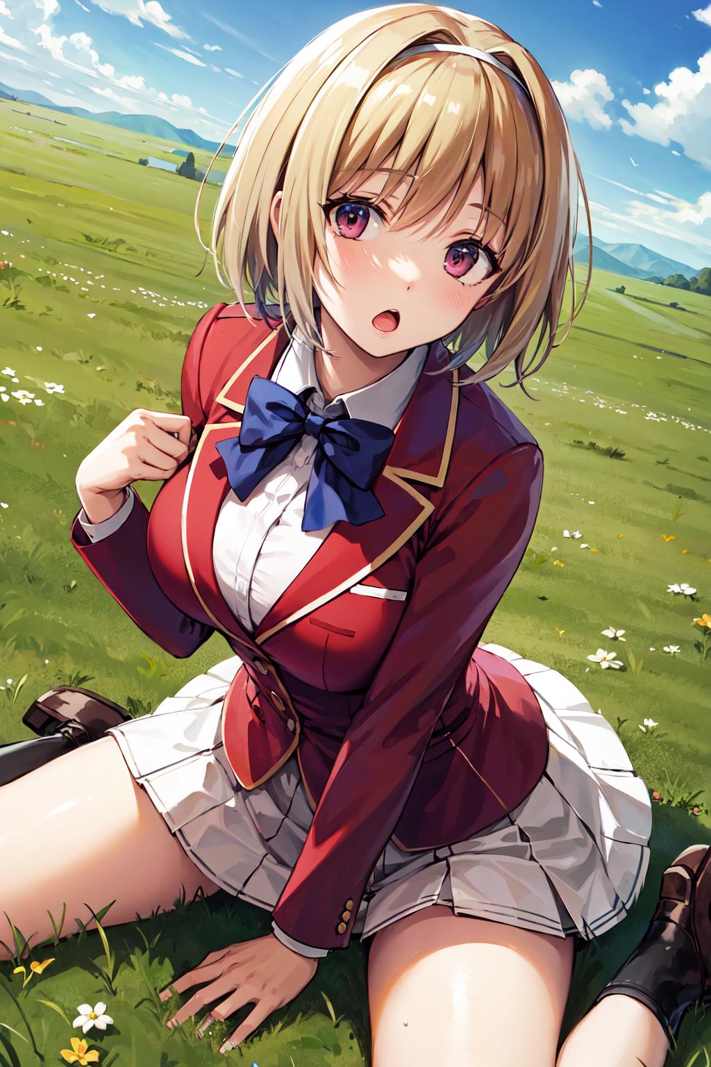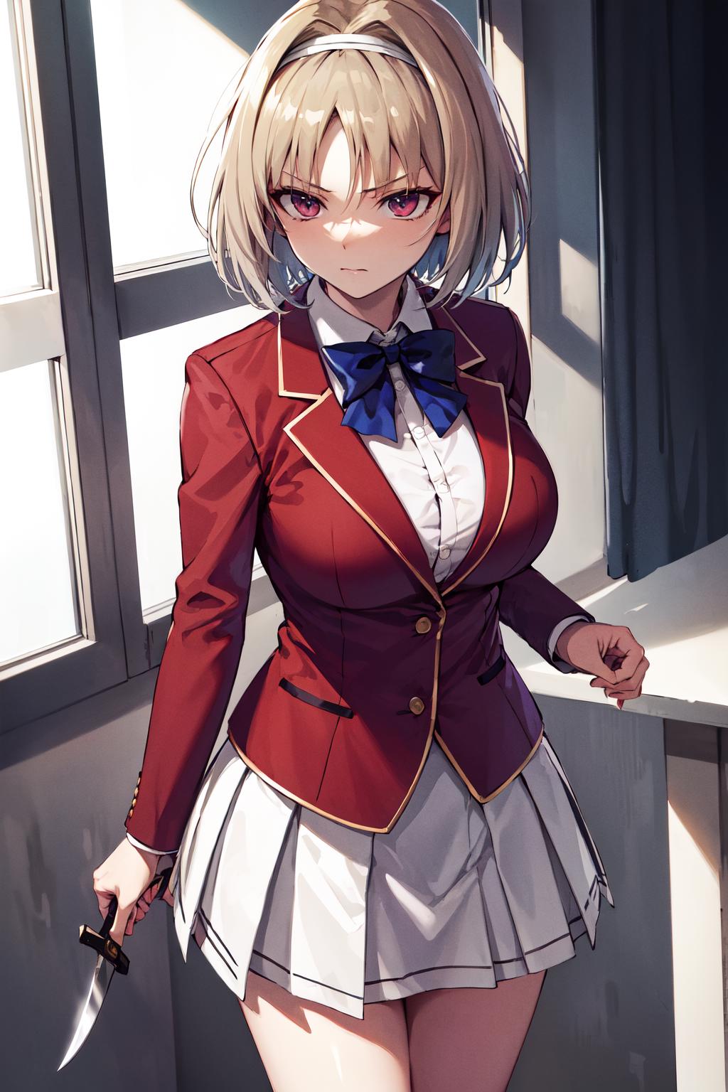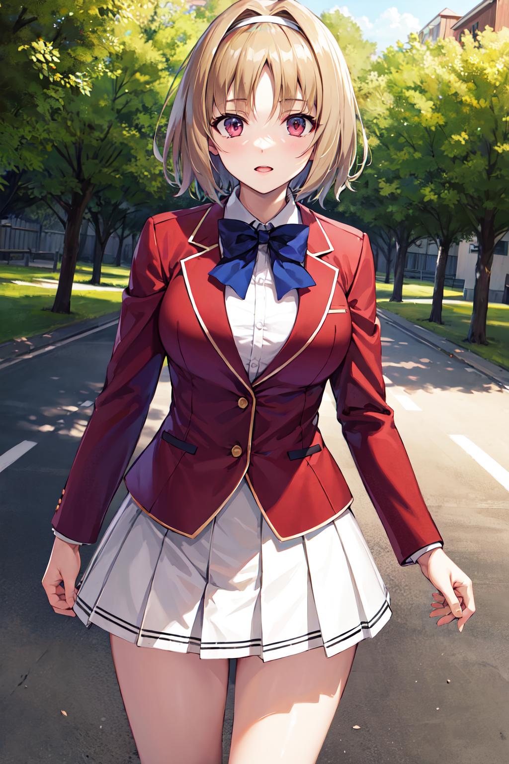 outfit1aakikyo, short hair, hair intakes, white hairband, blue bowtie, shirt, blazer, red jacket, long sleeves, white skirt, pleated skirt, black socks