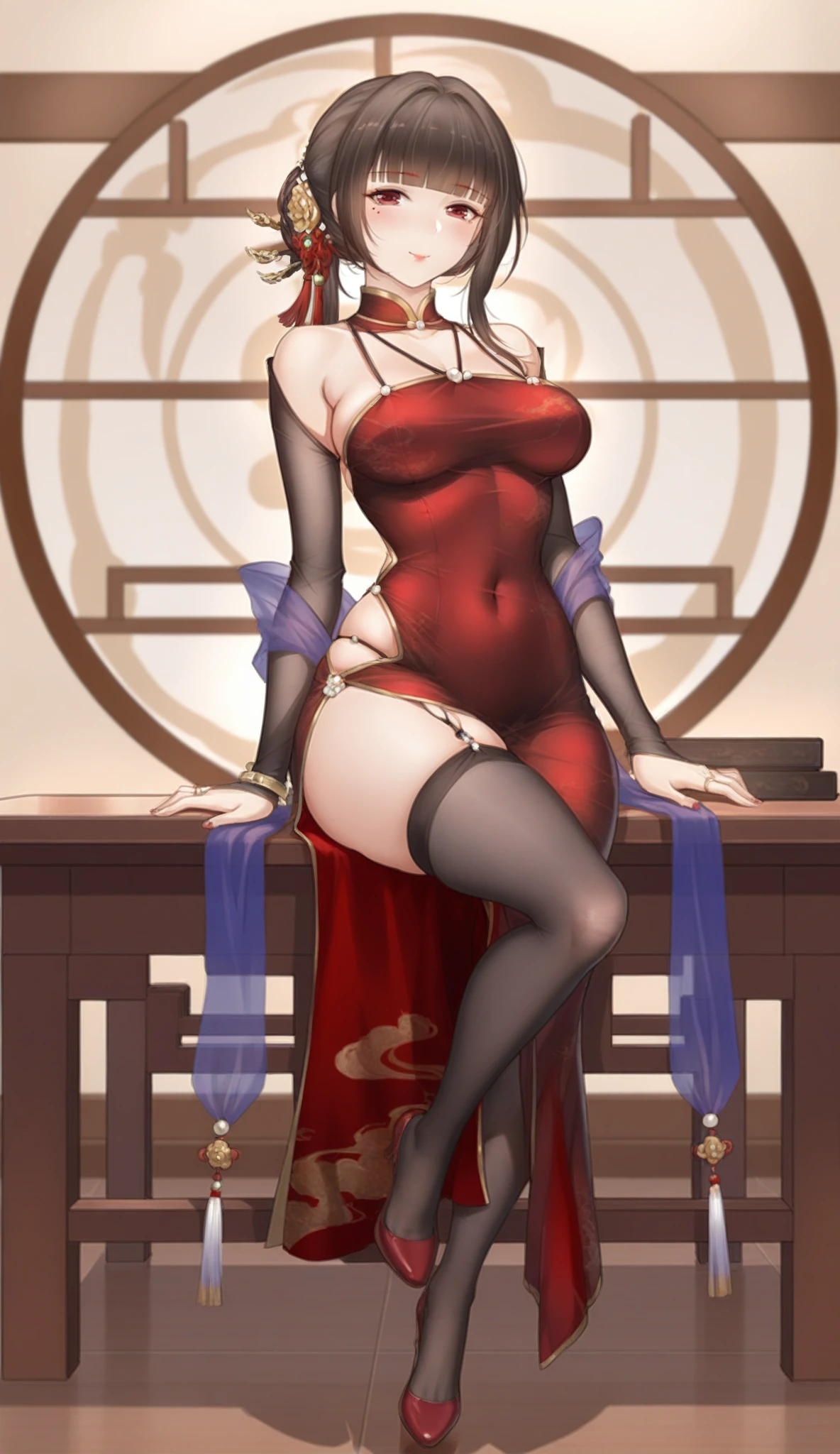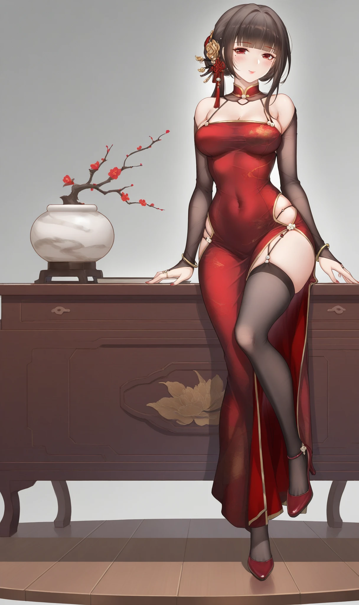 正面提示词:yat sen (style3),1girl,solo,red dress,red eyes,covered navel,side slit,red footwear,full body,black thighhighs,high heels,thighs,cleavage,pelvic curtain,closed mouth,hair flower,white background,mole under eye,black hair,medium breasts,single hair bun,tassel hair ornament,chinese knot,flower knot,panchang knot,china dress,chinese hairpin,hair stick,official alternate costume,blunt bangs,bracelet,blush,red nails,nail polish,detached sleeves,round window,mandarin collar,detached collar,collar,skindentation,garter straps,clothing cutout,bare shoulders,ring,table,leaning on table,leg up,standing on one leg,hand on table,looking at viewer,elbow gloves,black elbow gloves,bridal gauntlets,black bridal gauntlets,smile,chair,blue shawl,hagoromo,cloud print,xiangyun,medium hair,<lora:yat sen (style3) v1.1:1>