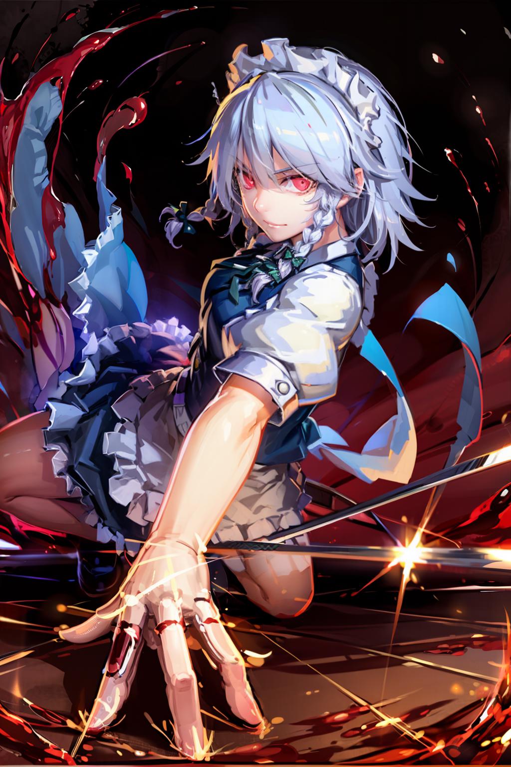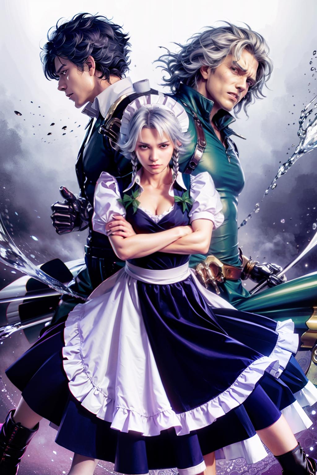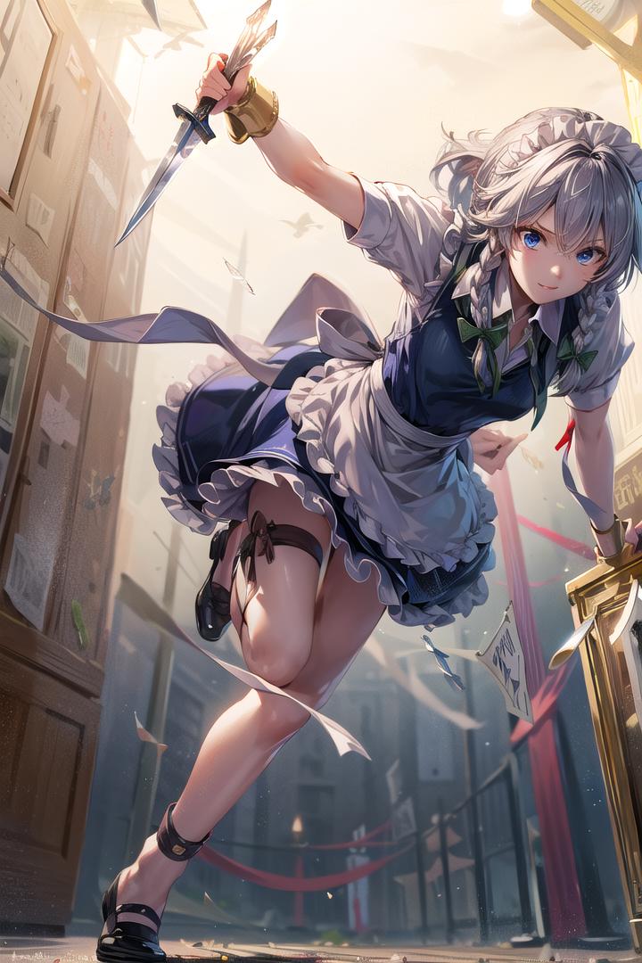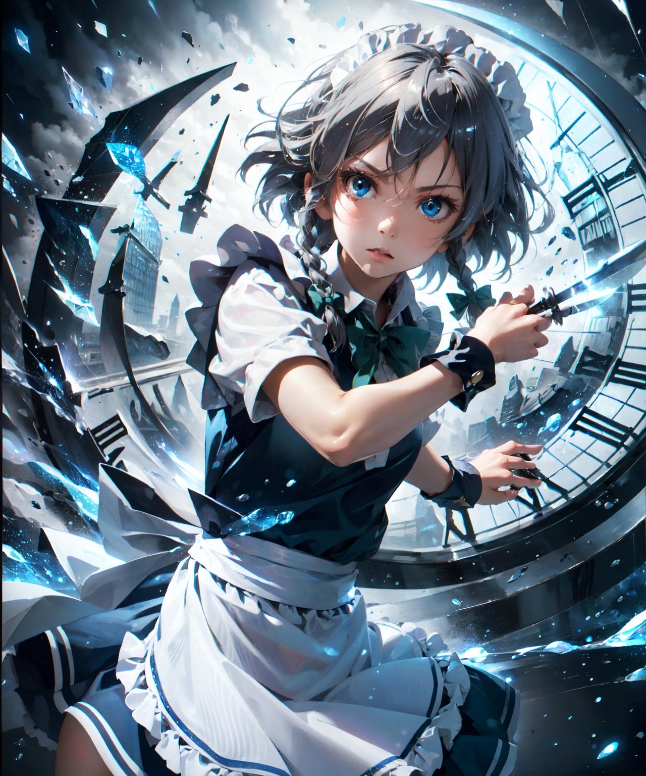 1girl,blue eyes, maid headdress, braid, grey hair, maid, twin braids, short hair, wrist cuffs, bow, hair bow, short sleeves, ribbon, apron,