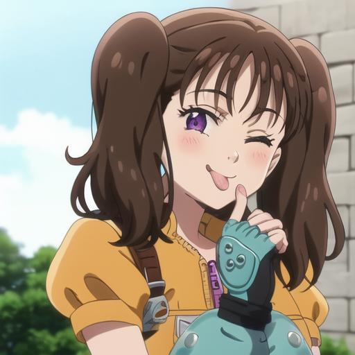 Produces very good results with the tags: seven deadly sins, diane, purple eyes, brown hair.