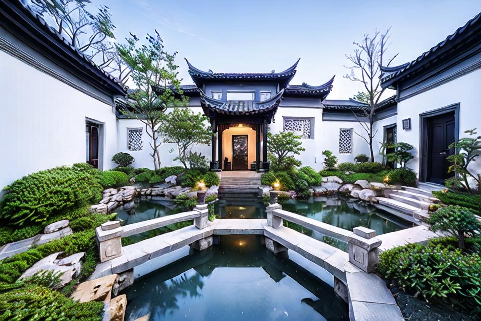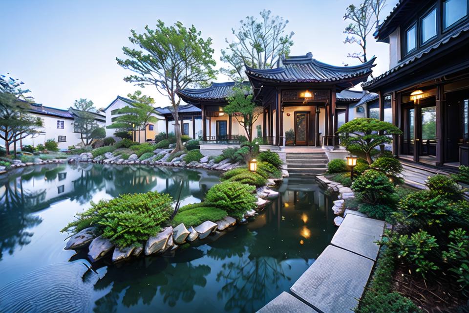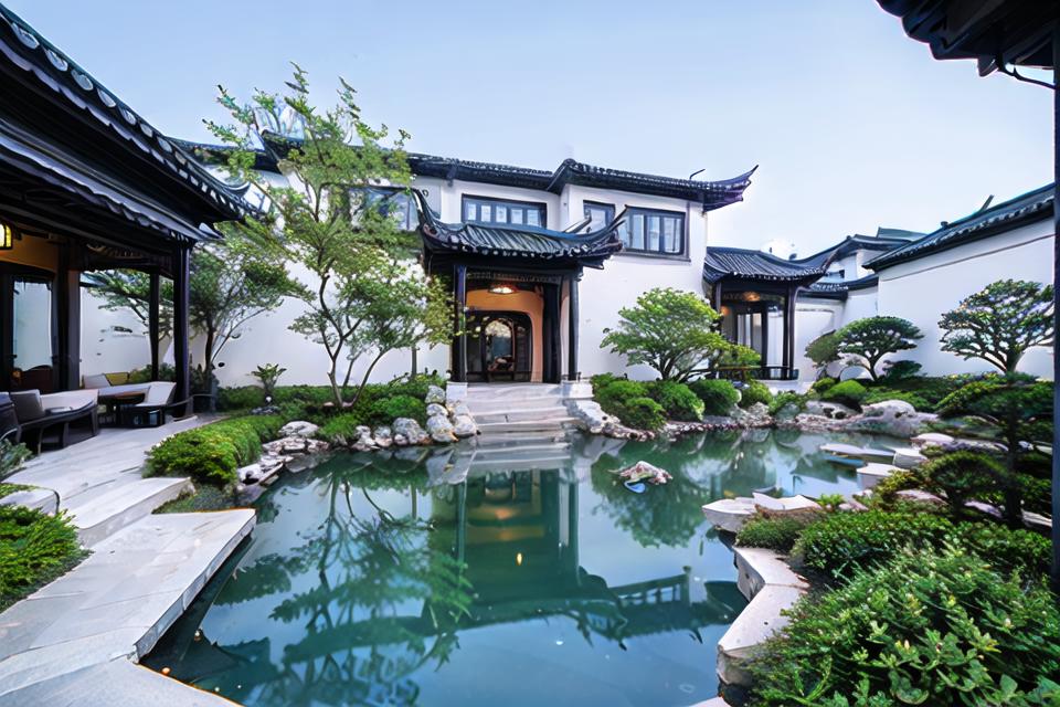 masterpiece, best quality, yuanlin, suzhou garden, traditional chinese garden, zutuan, yuanlin, scenery, tree, water pond, dark theme, high contrast, outdoors, flower, bush, lantern, stairs, plant, road, nature, stone lantern, architecture, path, sky,
