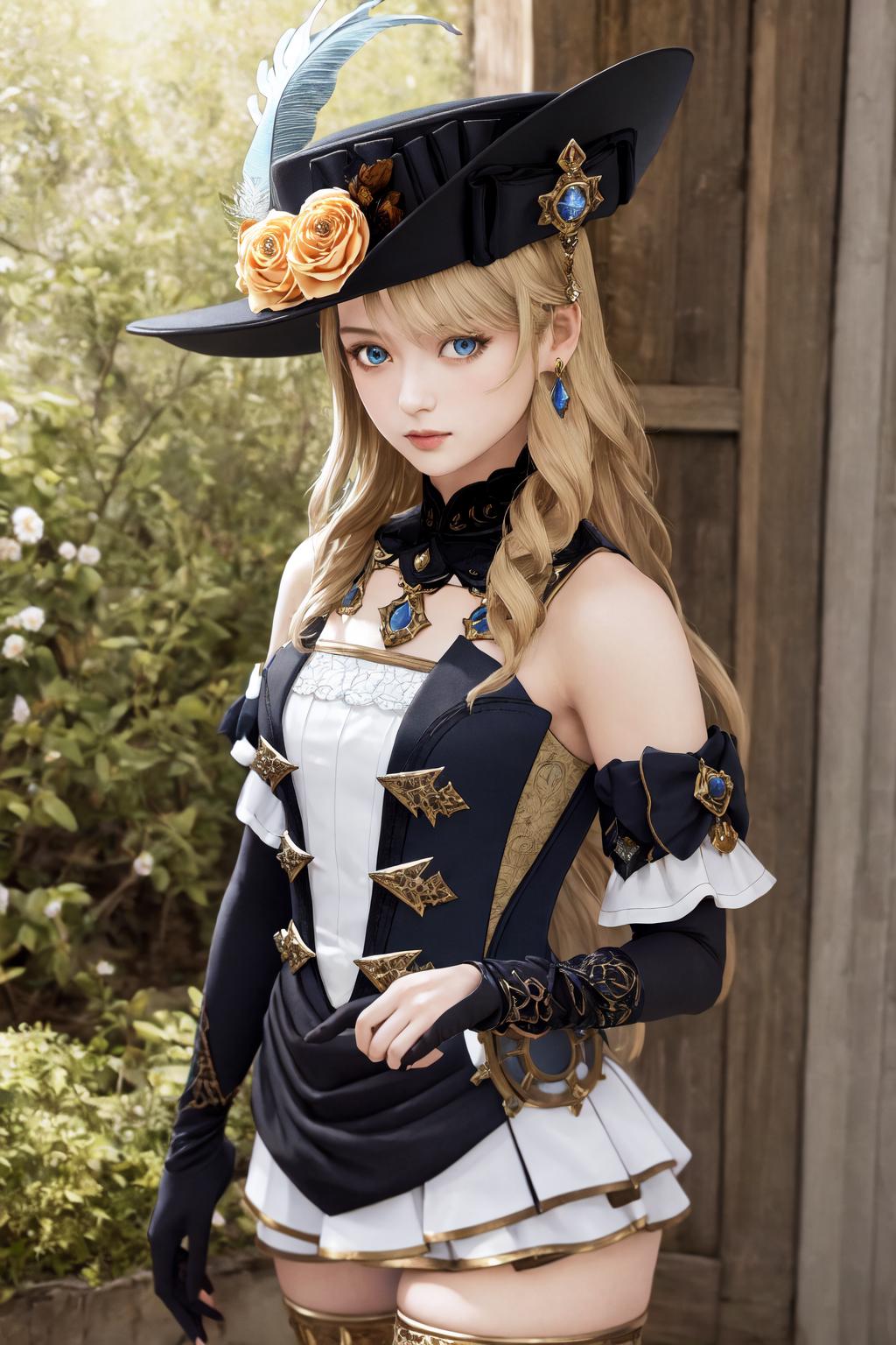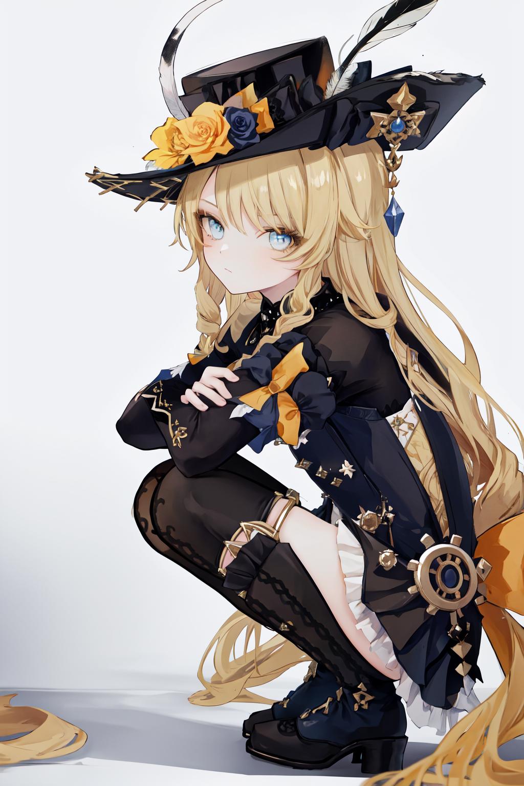 Default outfit: black headwear hat flower hat feather black thighhighs black gloves boots