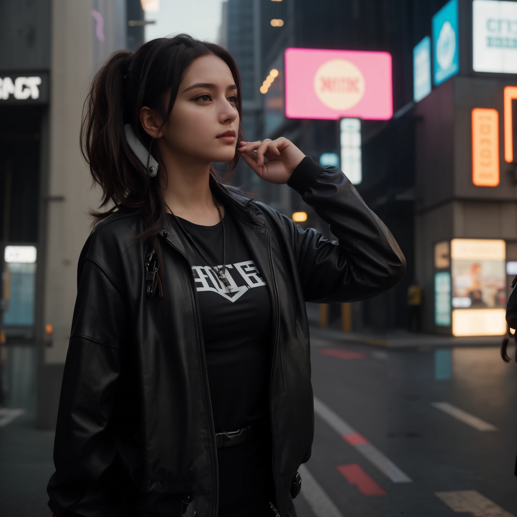 ポジティブ: 高層ビルが林立する未来的な街並み, 空を飛ぶ車が行き交っている, そしてネオンの光が夜を照らしている. 人々が賑わう通りを歩いている, 高度な服装や装飾品を身に付けている. Holographic billboards display viBrant advertisements, そしてドローンが荷物を配送している.