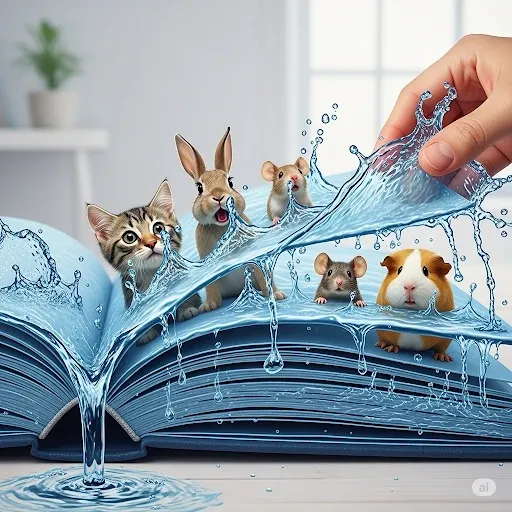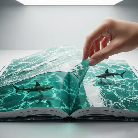 ภาพแบบภาพยนตร์ของหนังสือบนโต๊ะสีขาวในห้องสีขาว น้ำไหลออกมาจากหนังสือลงบนโต๊ะ และฝูงฝูงสัตว์กำลังว่ายน้ำและวิ่งอยู่ในน้ำในหนังสือ กระดาษพิเศษหนังสือพิเศษที่มีหน้ากระดาษทุกหน้าเป็นแผ่นน้ำใส โดยหนังสือเล่มนี้มีฝูงฝูงสัตว์วิ่งอยู่ครับในแผ่นหน้าหนังสือมี ฝูงสัตว์ที่วิ่งจนอยู่ในหน้าหนังสือที่เป็นน้ำนั้นขาจมลงไปในน้ำ มีมือมาเปิดพลิกหน้าหนังสือทำให้แผ่นหน้าหนังสือน้ำนั้นขึ้นมาท่วมผ่านทะลุตัวม้า 優雅に動き、水をはねる動物の群れ。写実的で動的で高解像度の画像 โดยหนังสือเล่มนี้มีฝูงฝูงสัตว์วิ่งอยู่ครับในแผ่นหน้าหนังสือมี ฝูงสัตว์ร้องอย่างบ้าคลั่ง เสียงฝีเท้าม้ากระทบคลื่นน้ำ