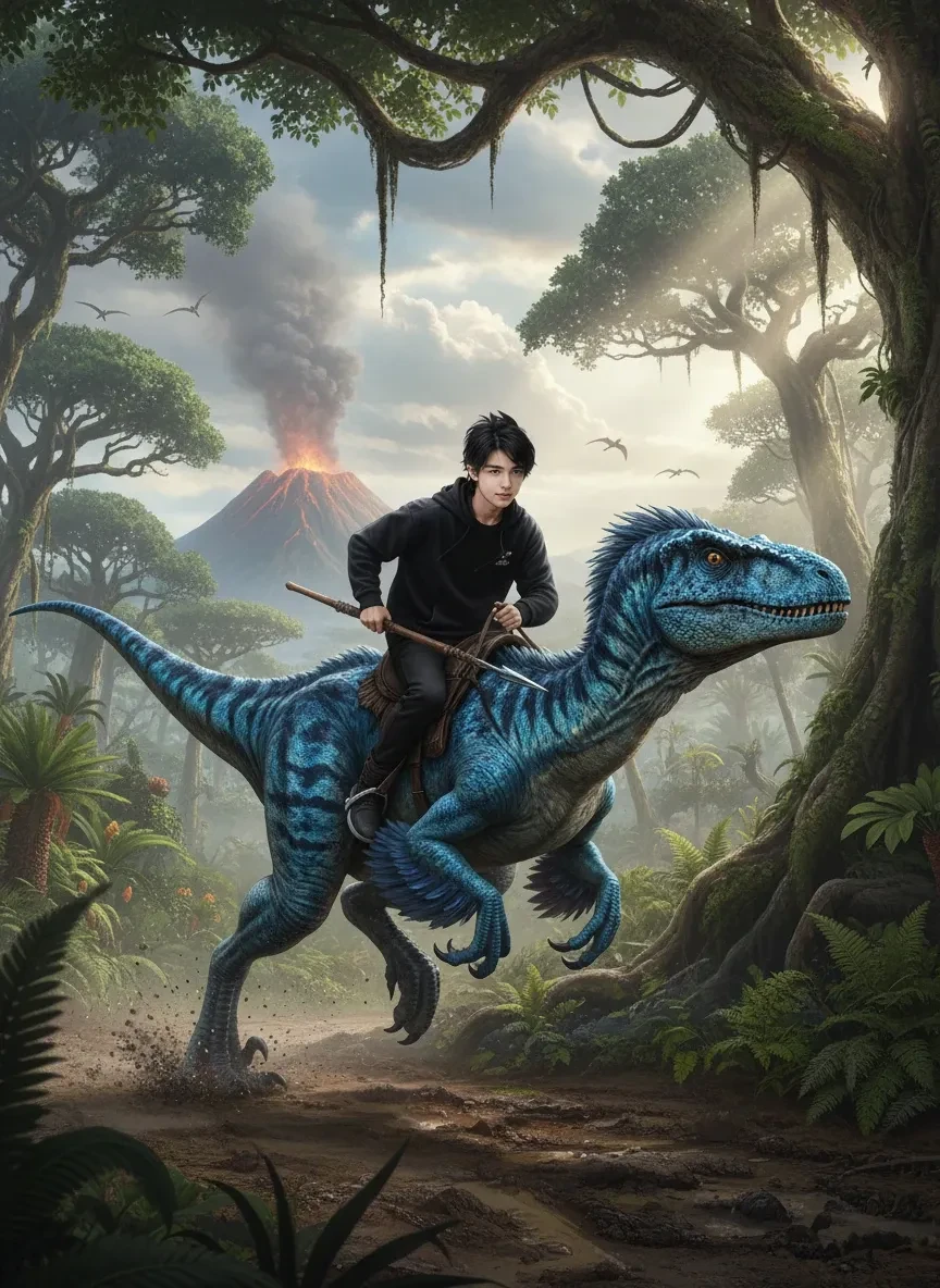 恐竜に乗る文字, カメラに向かって直接充電する. 文字は元の顔を保ち、恐竜が力強い歩幅で前に進む中、カメラに向かって大胆で激しい表情を見せる.