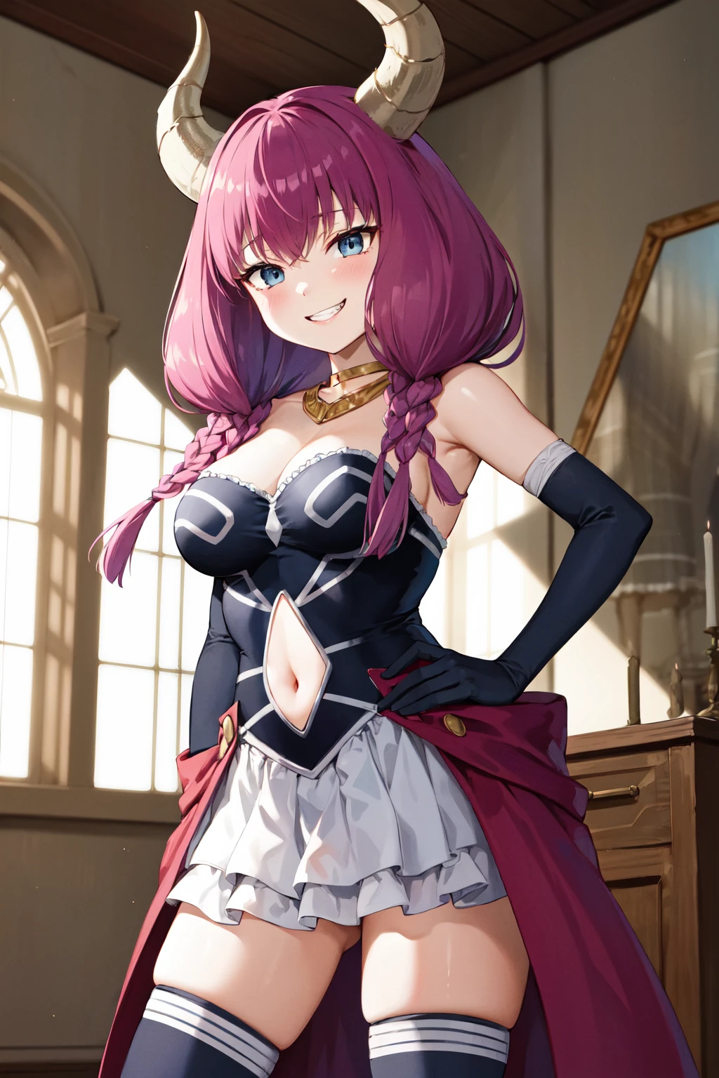 aaaura, braid, twin braids, horns, blue eyes, choker, necklace, strapless dress, elbow gloves, black gloves, navel cutout, white skirt, black thighhighs