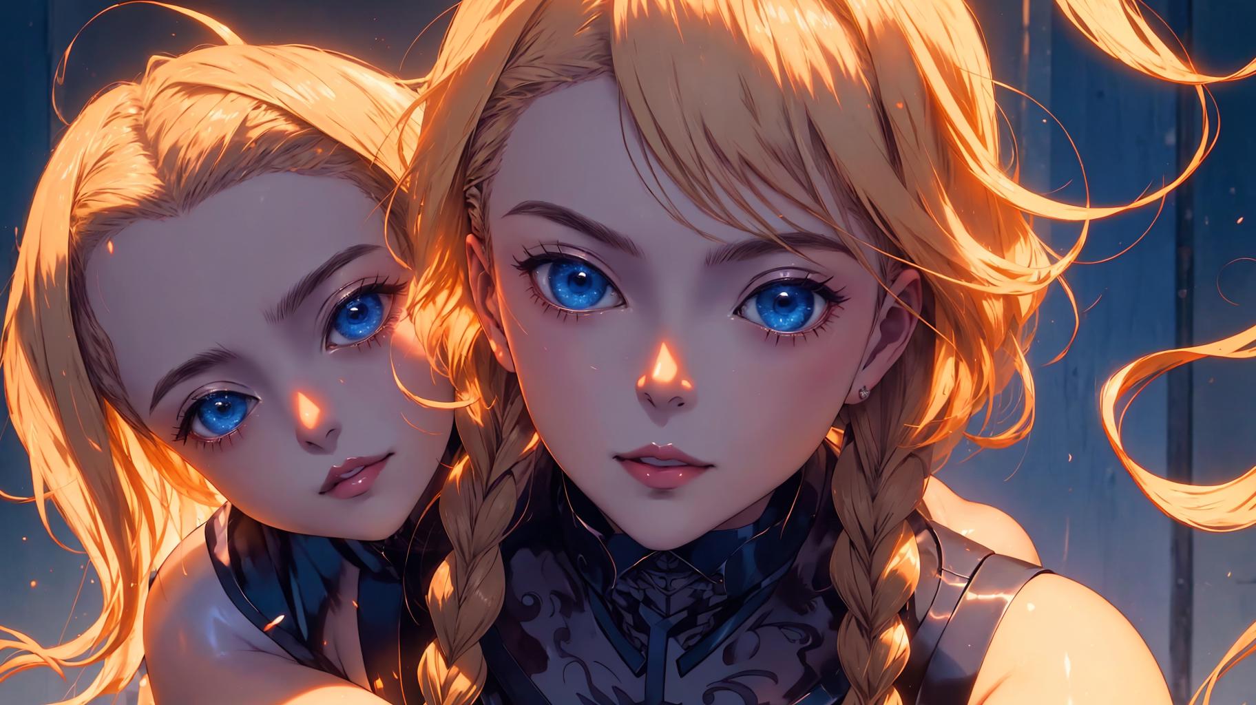 (best quality:1.1), (masterpiece:1.2), (detailed:1.1),LeinaQuiron woman, 1girl, solo, long hair, ???????, blue eyes, blonde hair, ?????????????, cleavage, weapon, braid, hairband, sword, armor, twin braids, revealing clothes, buckle,<lora:quiron_Leina_v1_Lora:1>