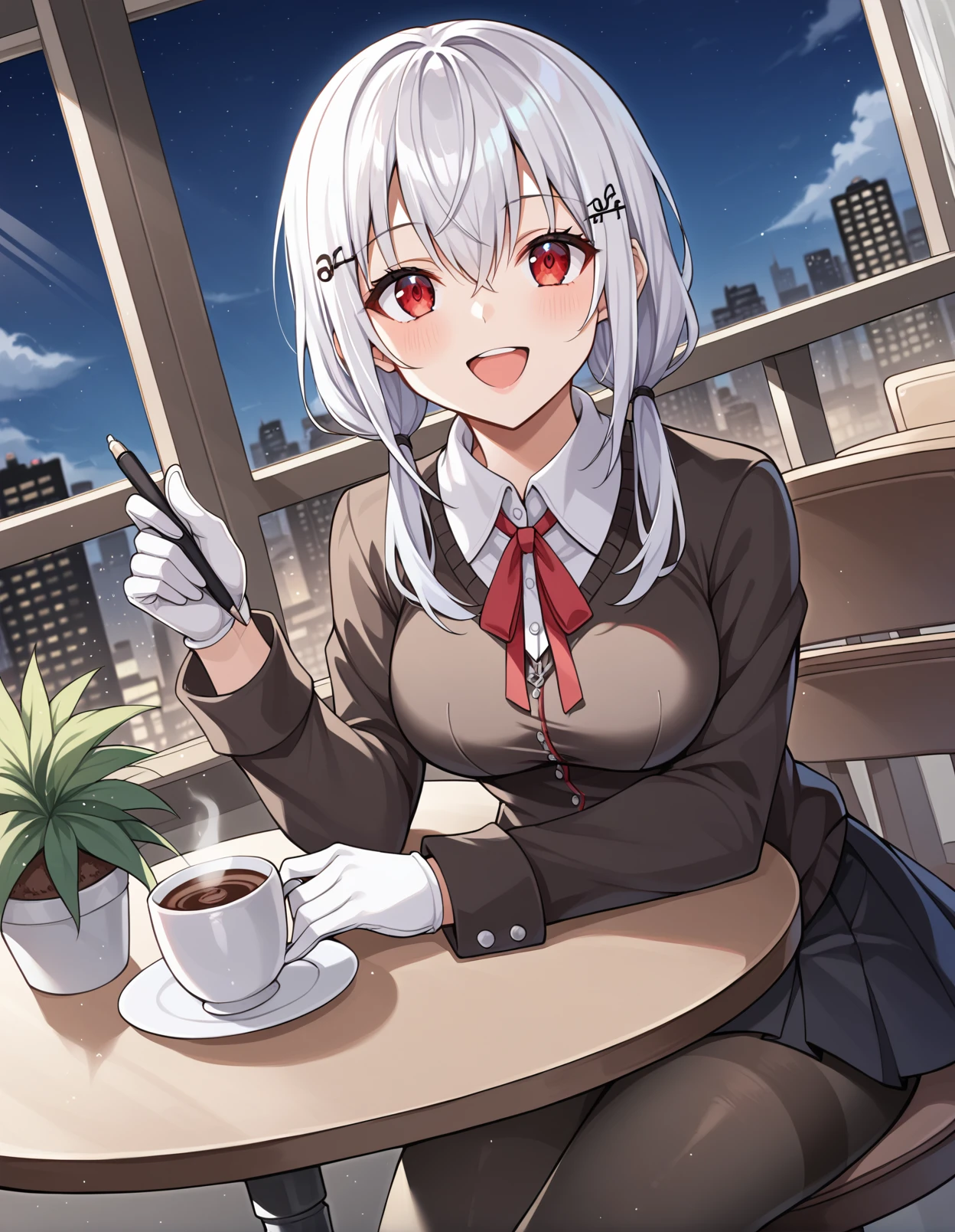 hairclip, neck ribbon, red ribbon, black sweater, collared shirt, open jacket, white jacket, flower, brown belt, long sleeves, sleeves past wrists, white gloves, pleated skirt, black skirt, black pantyhose