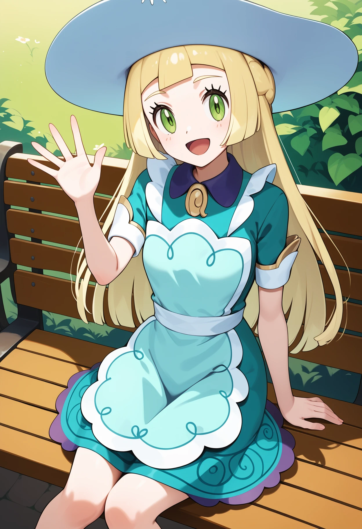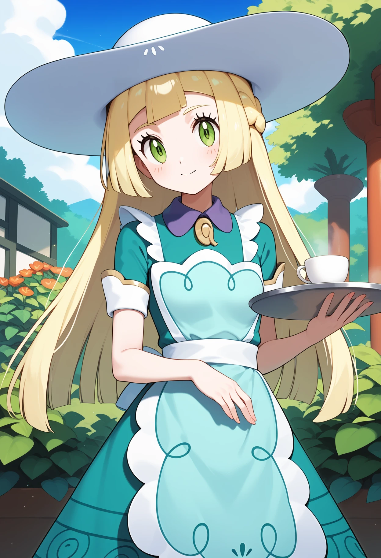 aalillie, long hair, blonde hair, hat, white headwear, green eyes, small ???????, green dress, short sleeves, green apron