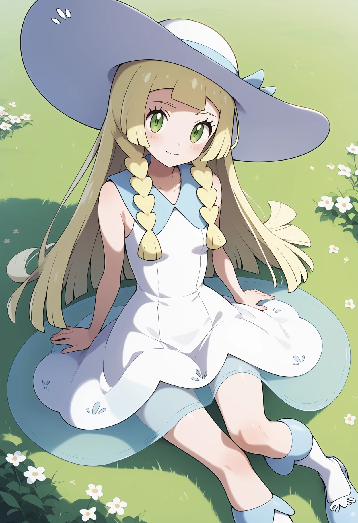 aalillie, long hair, blonde hair, twin braids, sun hat, white headwear, green eyes, small breasts, collared dress, white dress, sleeveless, see-through