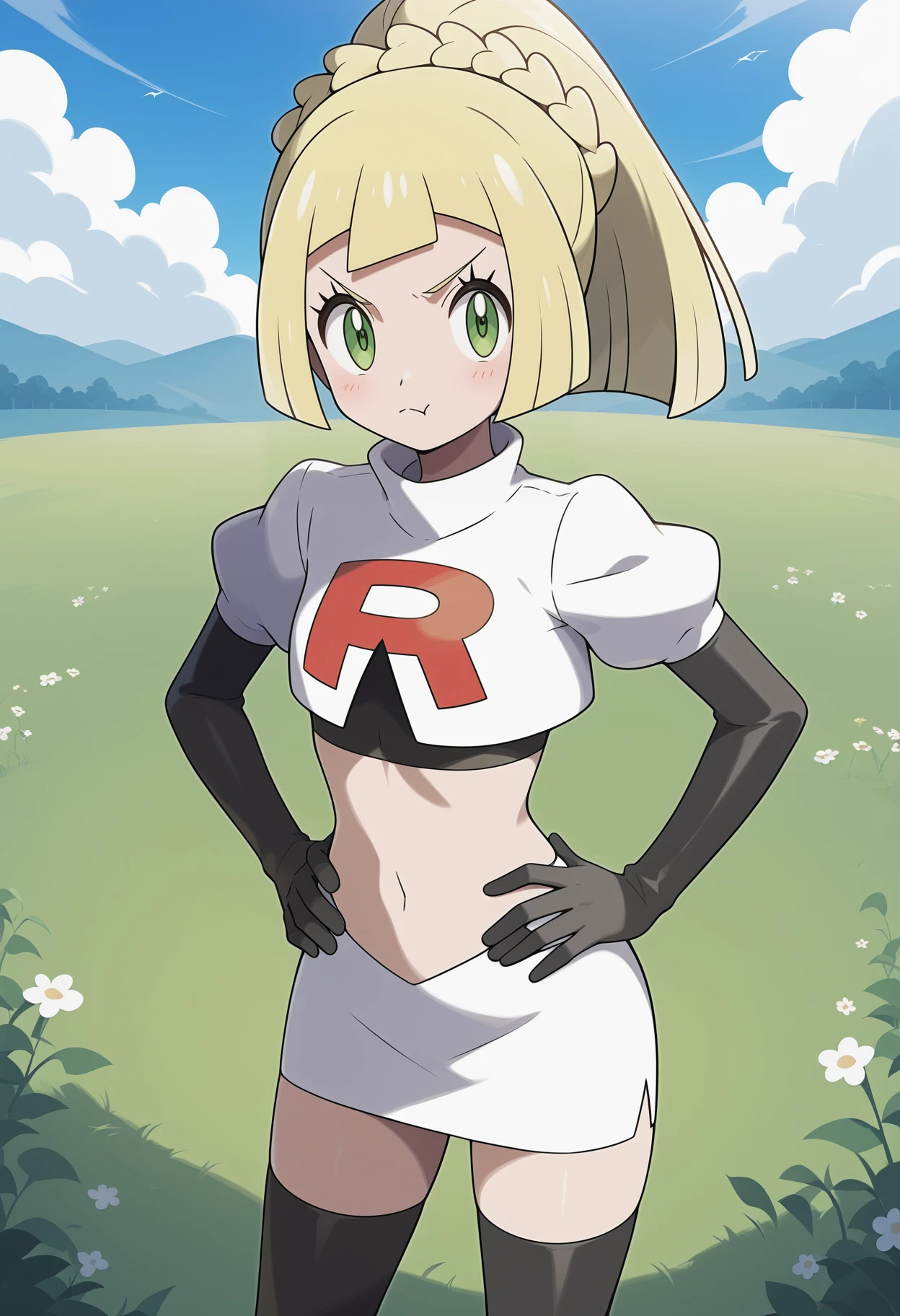aalillie, long hair, blonde hair, french braid, ponytail, green eyes, small ???????, cosplay, team rocket uniform, crop top, white jacket, elbow gloves, black gloves, midriff, miniskirt, white skirt, black thighhighs
