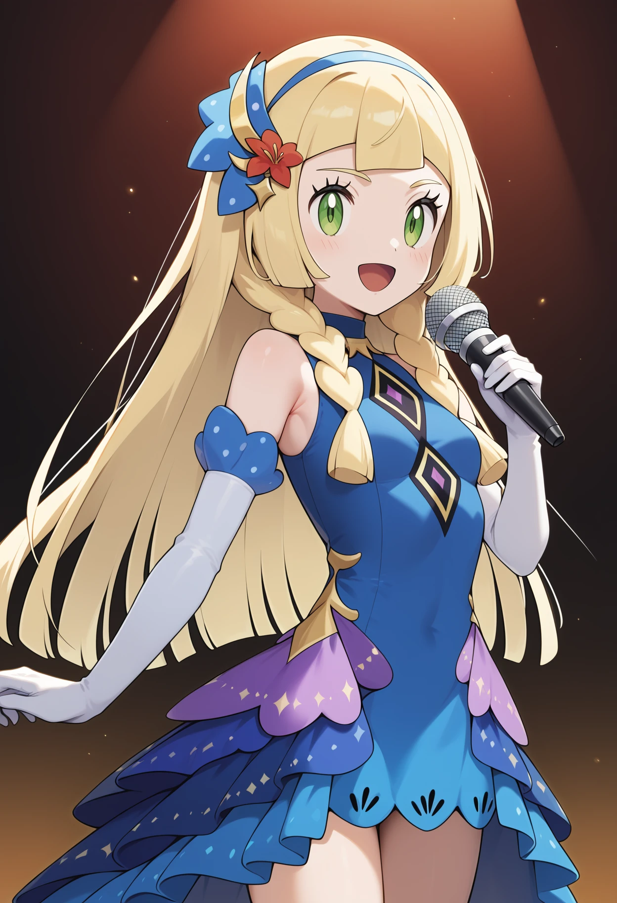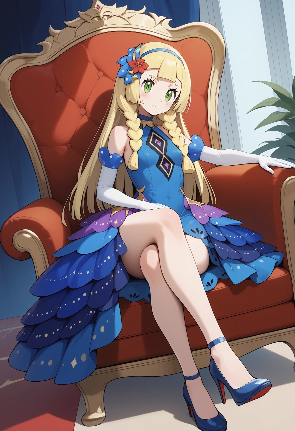 aalillie, long hair, blonde hair, twin braids, blue hairband, hair flower, hair ornament, green eyes, small breasts, blue dress, sleeveless, elbow gloves, white gloves