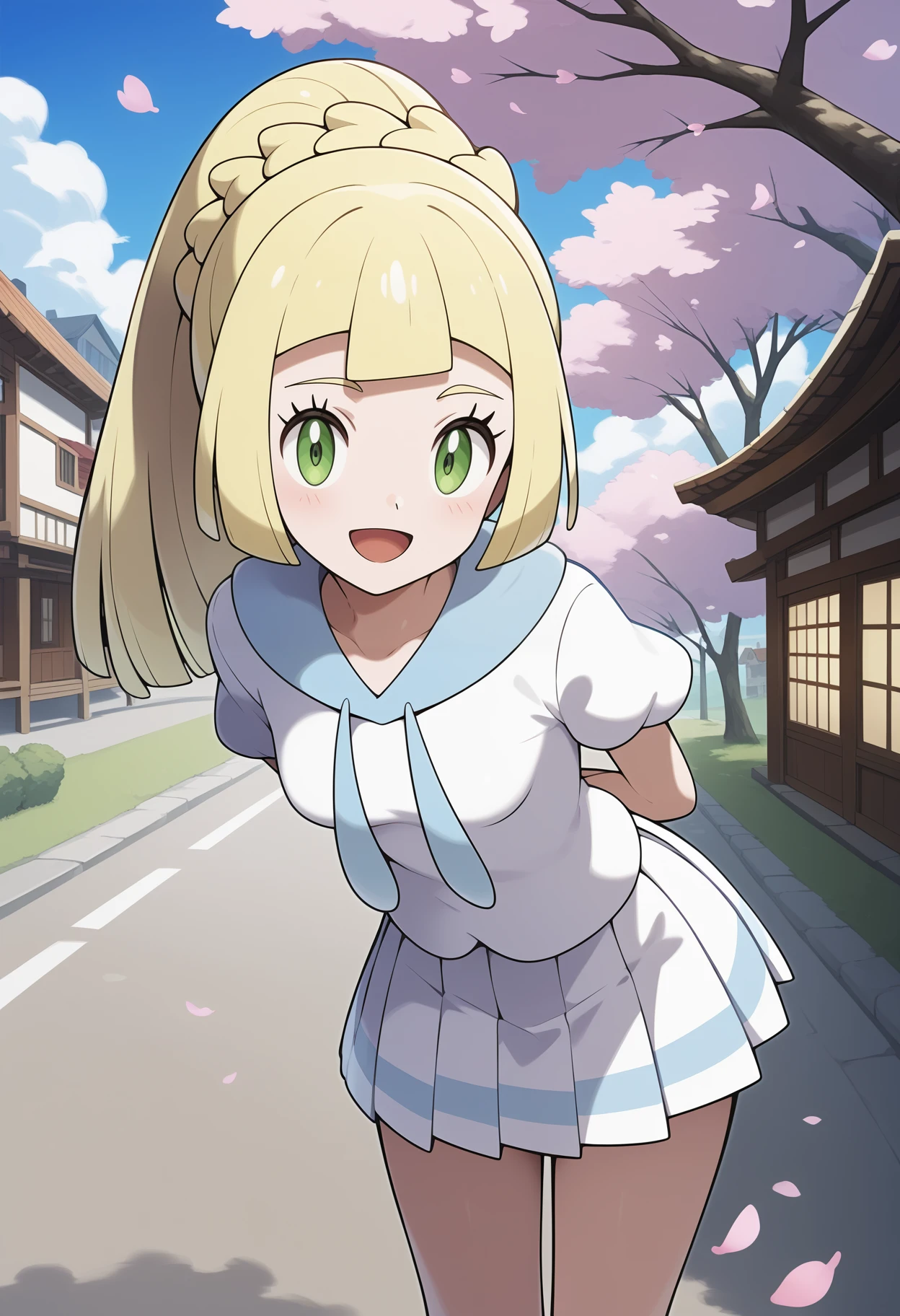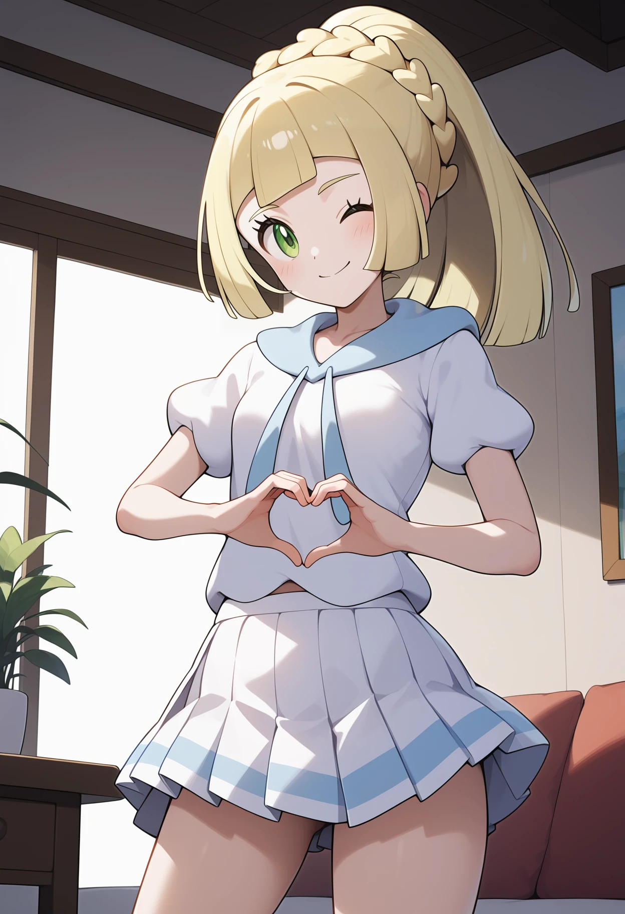 aalillie, long hair, blonde hair, french braid, ponytail, green eyes, small breasts, white shirt, short sleeves, pleated skirt, white skirt