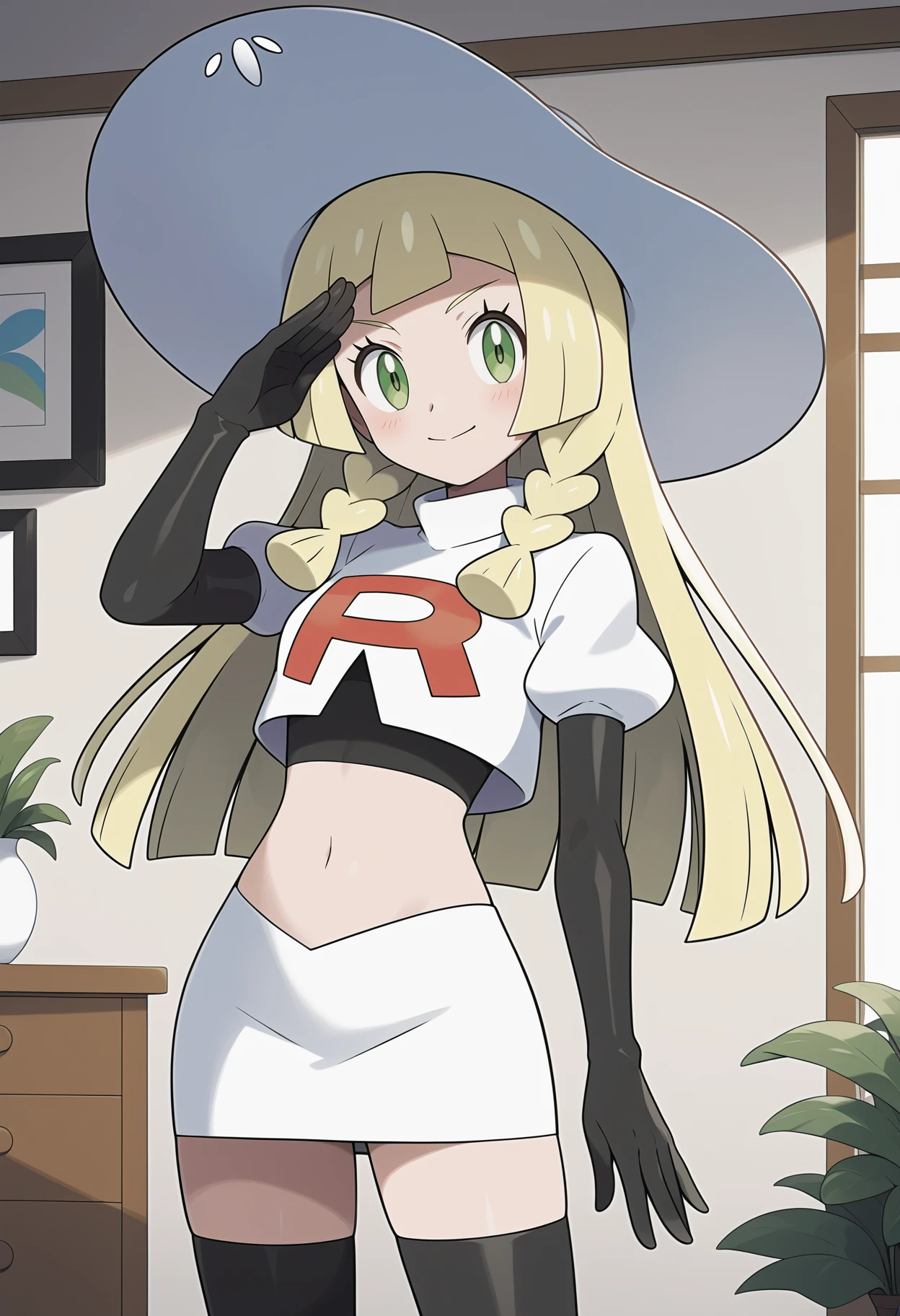 aalillie, long hair, blonde hair, twin braids, sun hat, white headwear, green eyes, small breasts, cosplay, team rocket uniform, crop top, white jacket, elbow gloves, black gloves, midriff, miniskirt, white skirt, black thighhighs