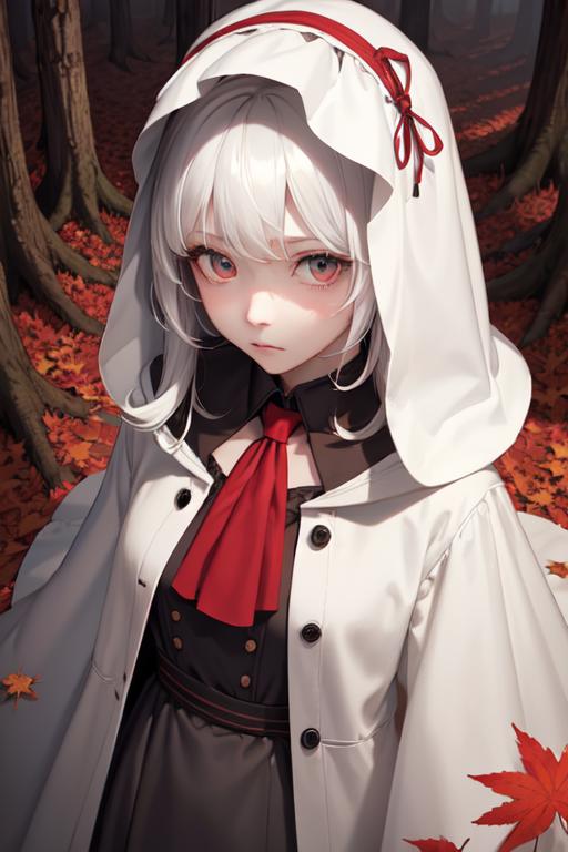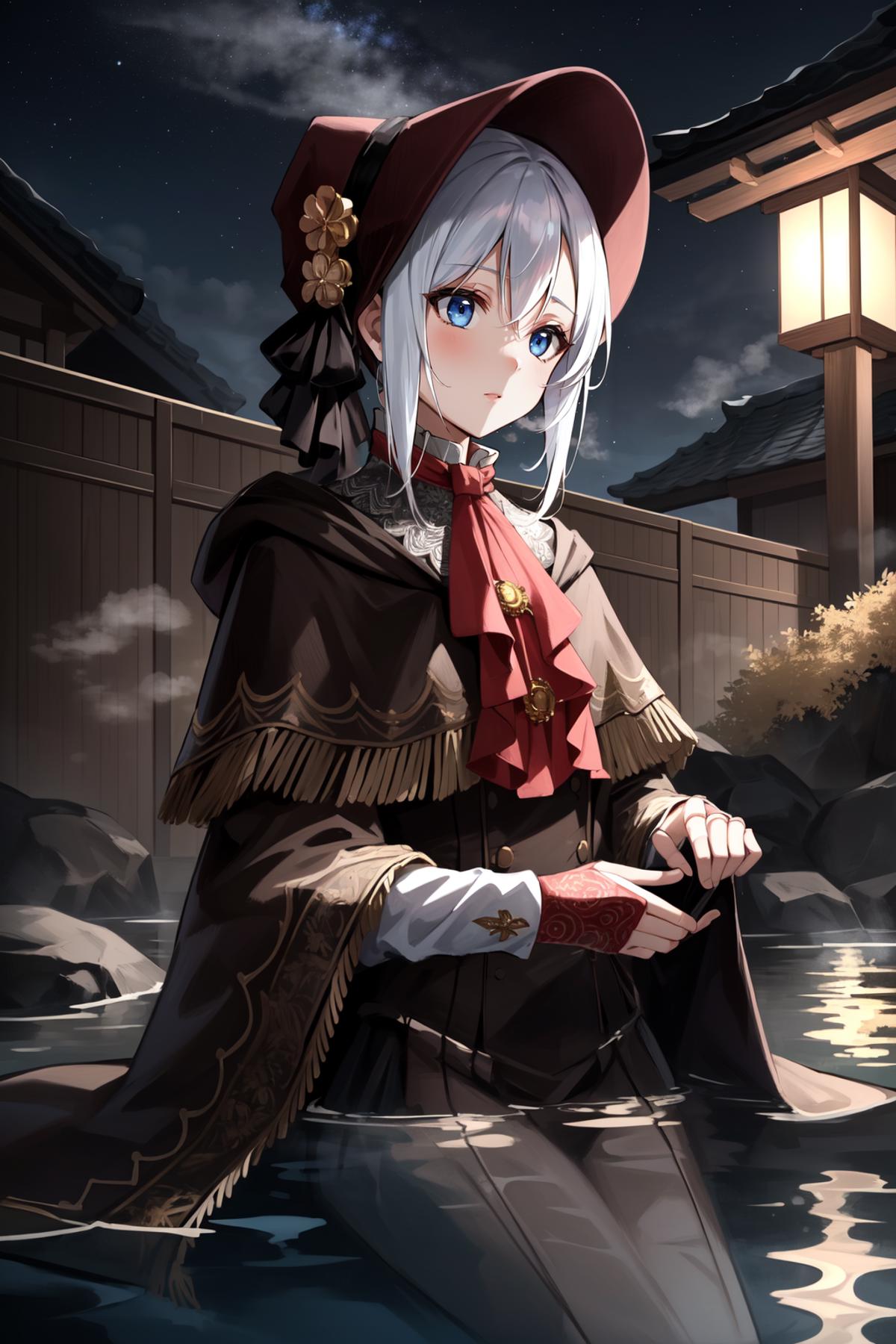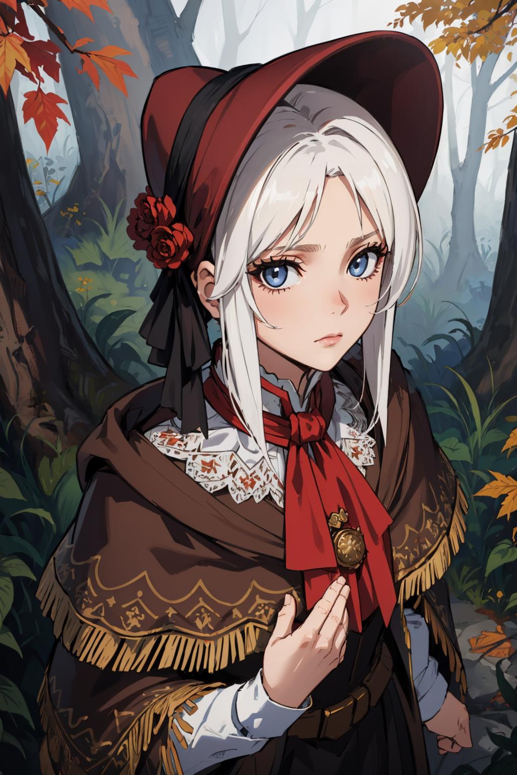 Add "bonnet, brown cloak, long dress, red ascot" for her typical look.