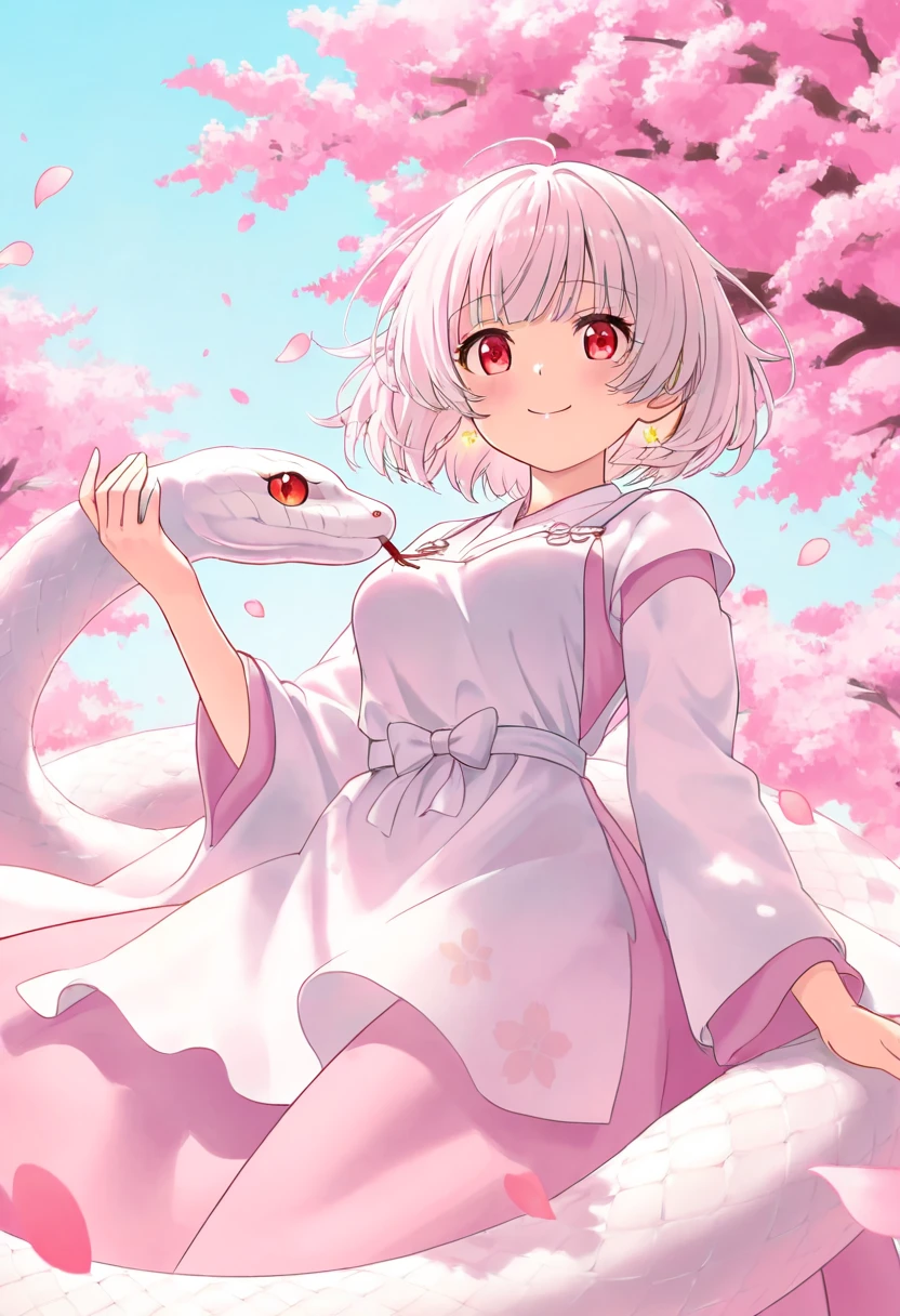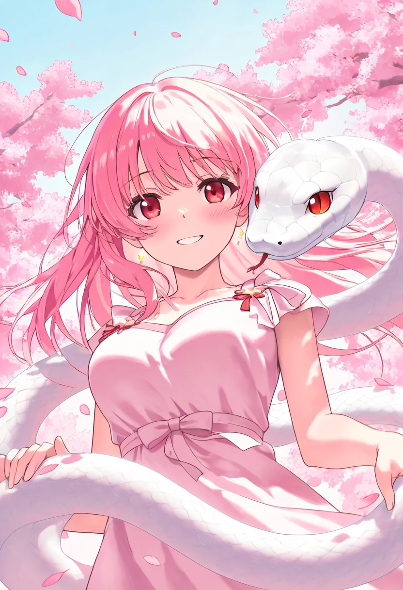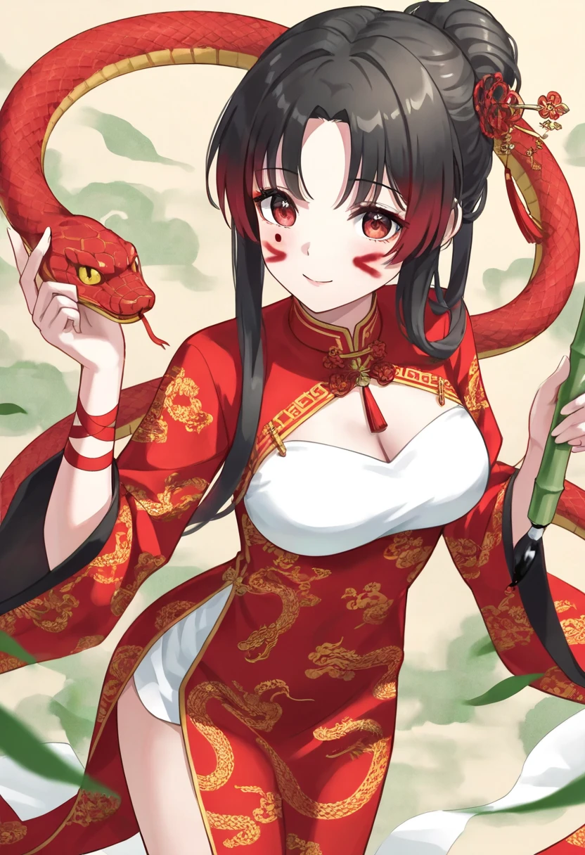 推荐大模型:WAI-Pluralistic-Noob推荐提示词:snakegirl,An animated image of a woman in a red and white qipao with a red rose in her hair. The woman is holding a white snake in her arms. The snake has a white body and red eyes.The background is a vibrant red with yellow fireworks in the background.