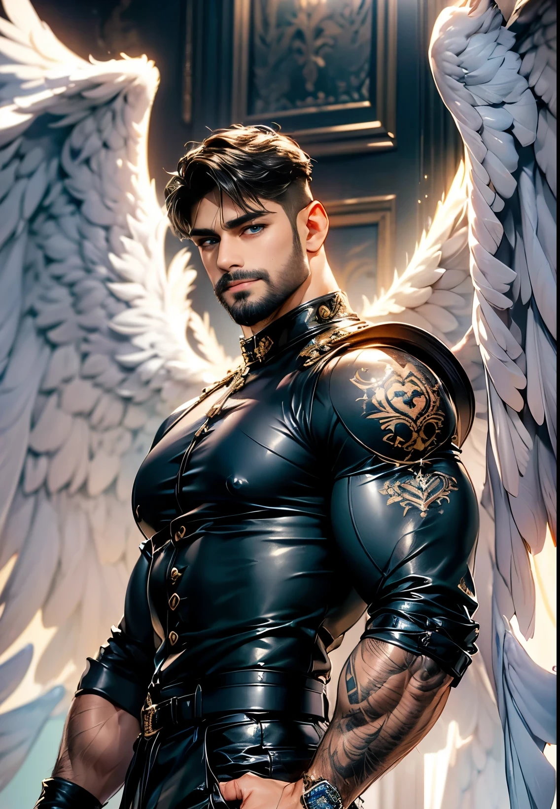 Daegan(1), male_character, detailed_face, angel wings (symmetrical style), blue eyes (iris color), short beard, black hair, belt, silver belt buckle, elegant clothing (open dark gray trench coat), elegant pants, tattooed, tattooed arm(body), visual harmony, epic landscape, extremely detailed CG unity 4k wallpaper, best quality, amazing quality, very aesthetic.