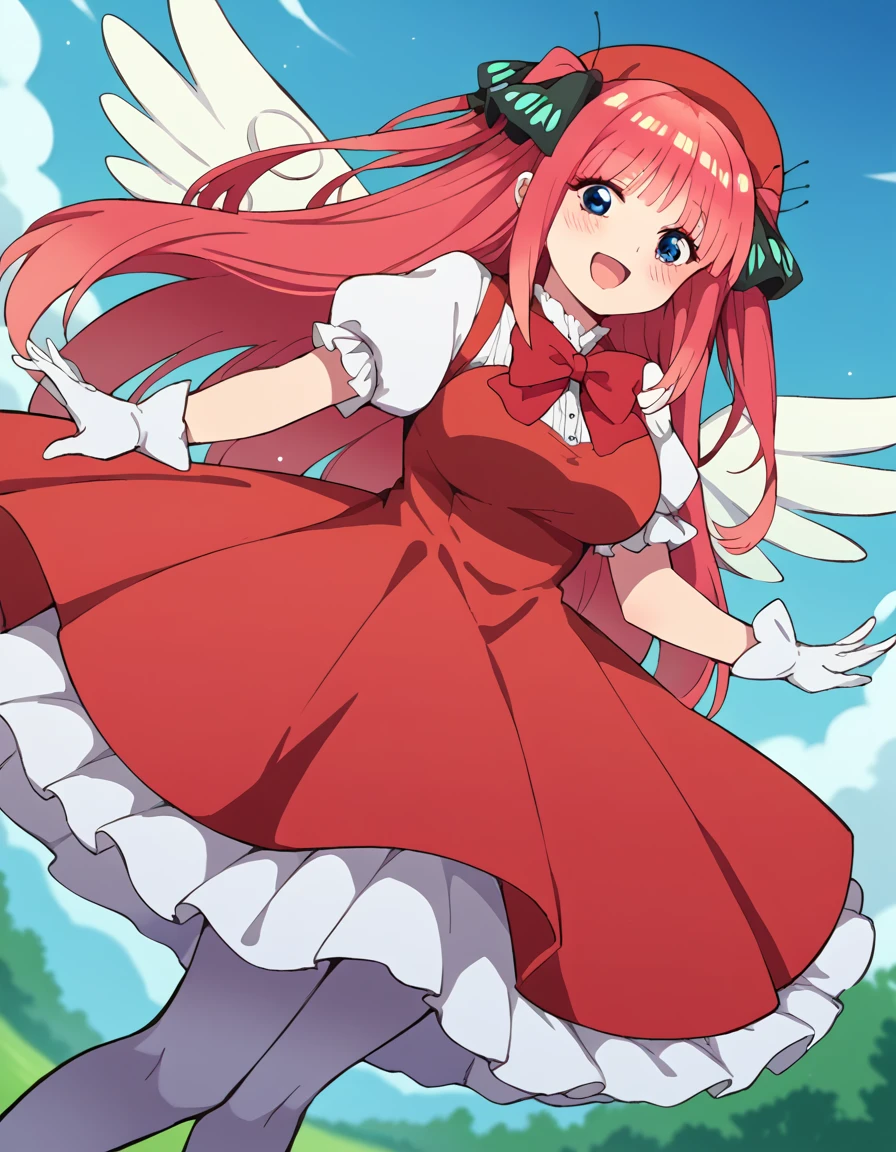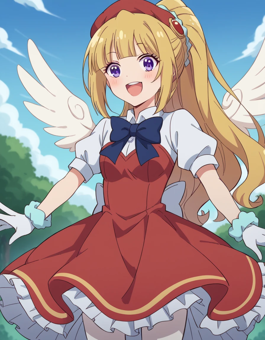 <lora:sakura-kinomoto-cosplay-ponyxl-lora-nochekaiser:1>, sakurakinomotocosplay, kinomoto sakura \(cosplay\), bow, bowtie, dress, gloves, hat, magical girl, pantyhose, petticoat, ppuffy short sleeves, puffy sleeves, red bow, red bowtie, red dress, red hat, short sleeves, white gloves, white pantyhose, white wings, wings,