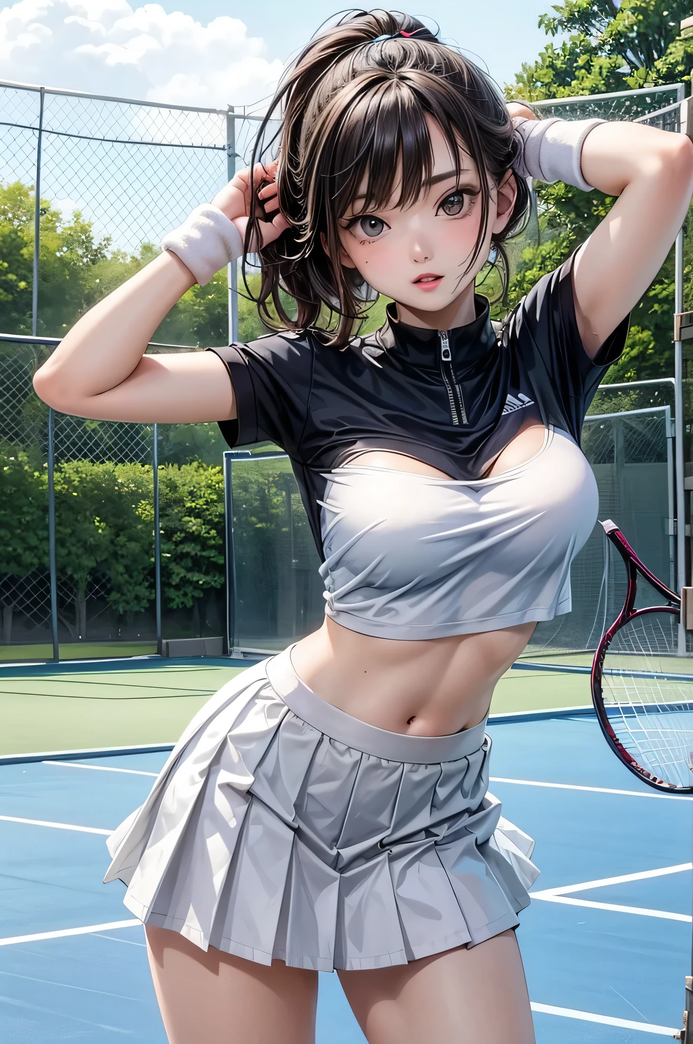 1girl, solo, white polo shirt, white sneakers, tennis wear, white miniskirt