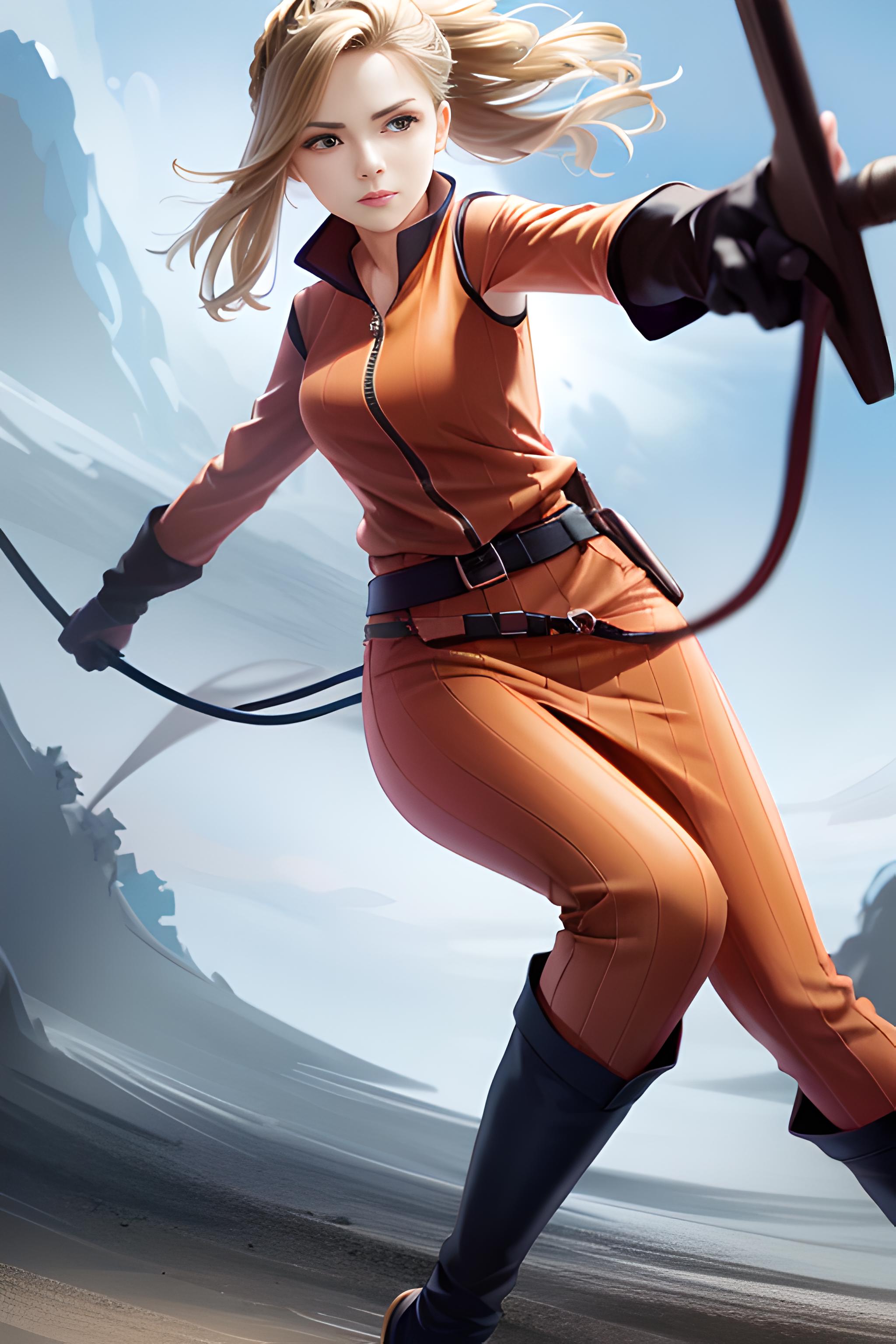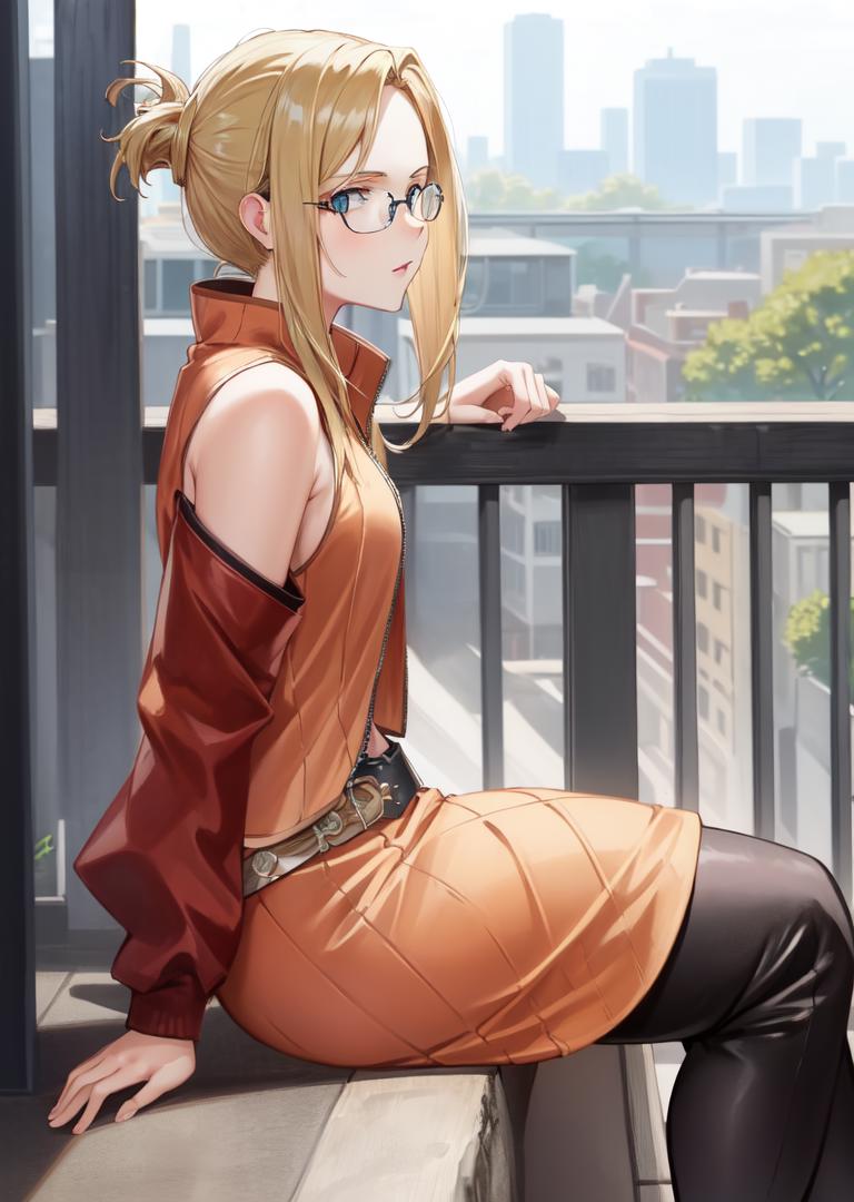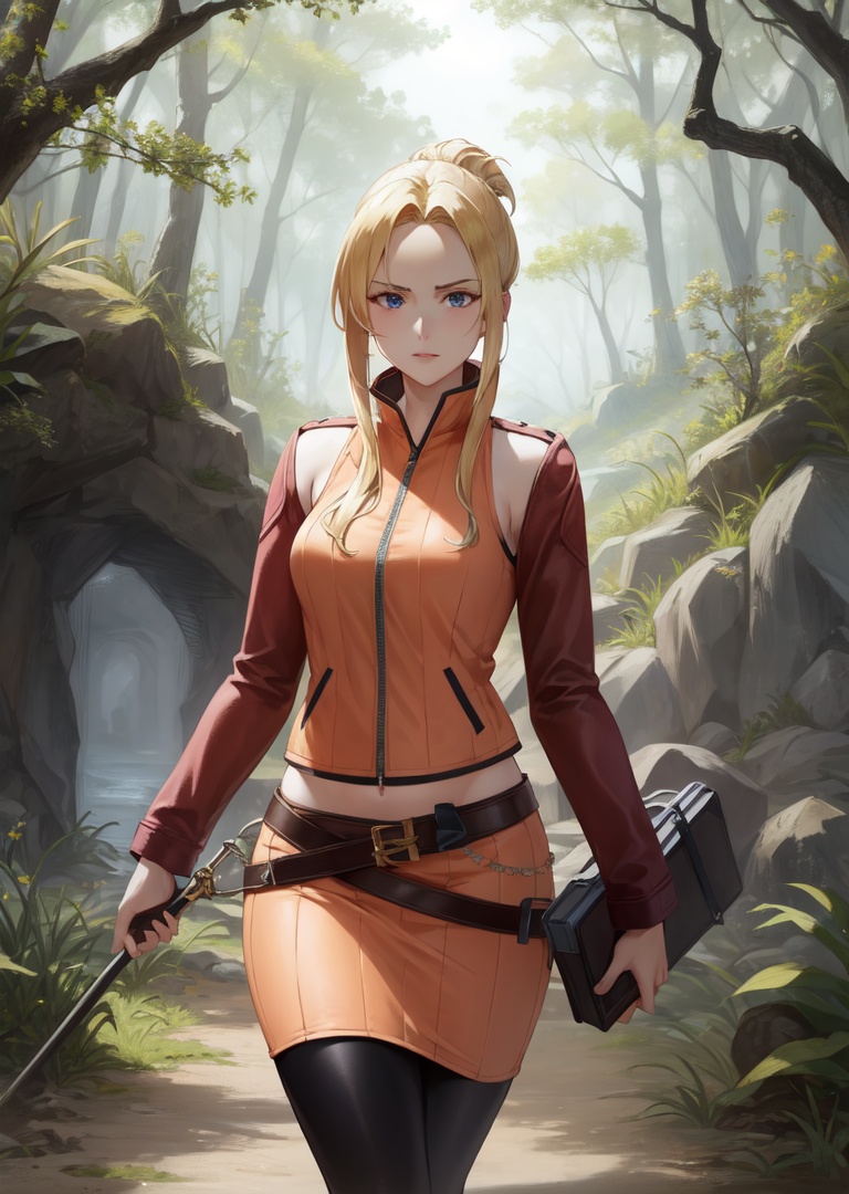 orange jacket, detached sleeves, orange skirt, belt, leggings, boots