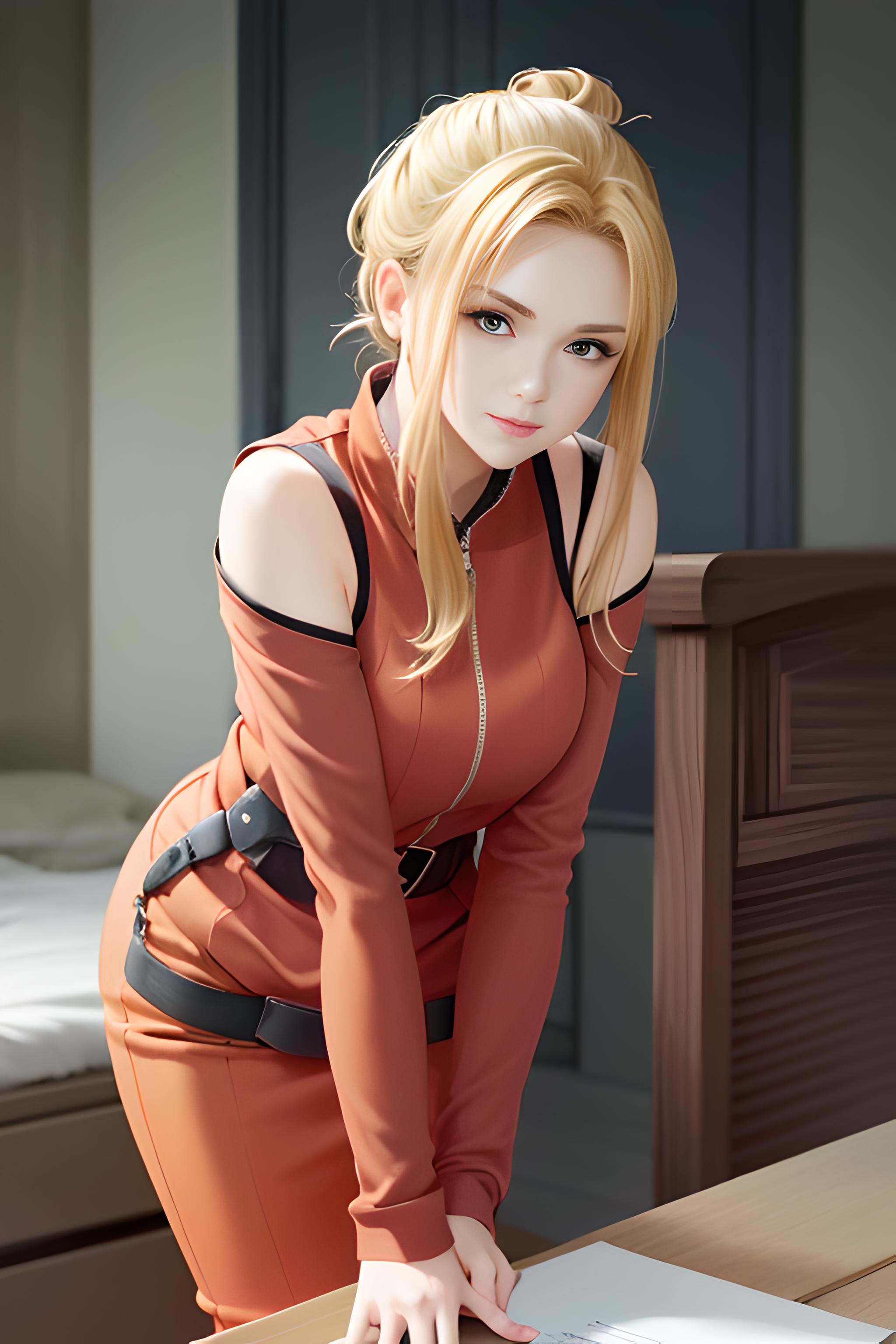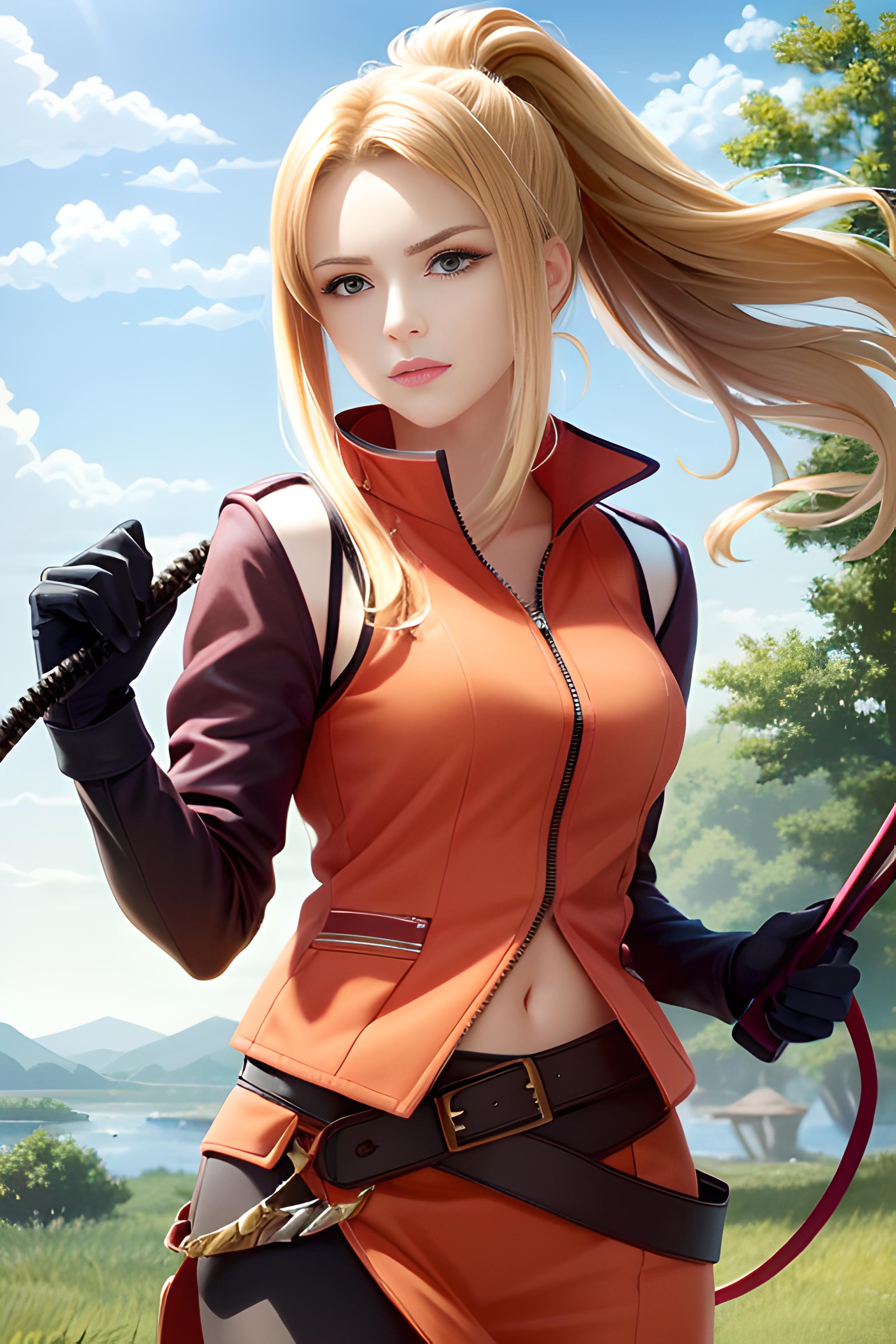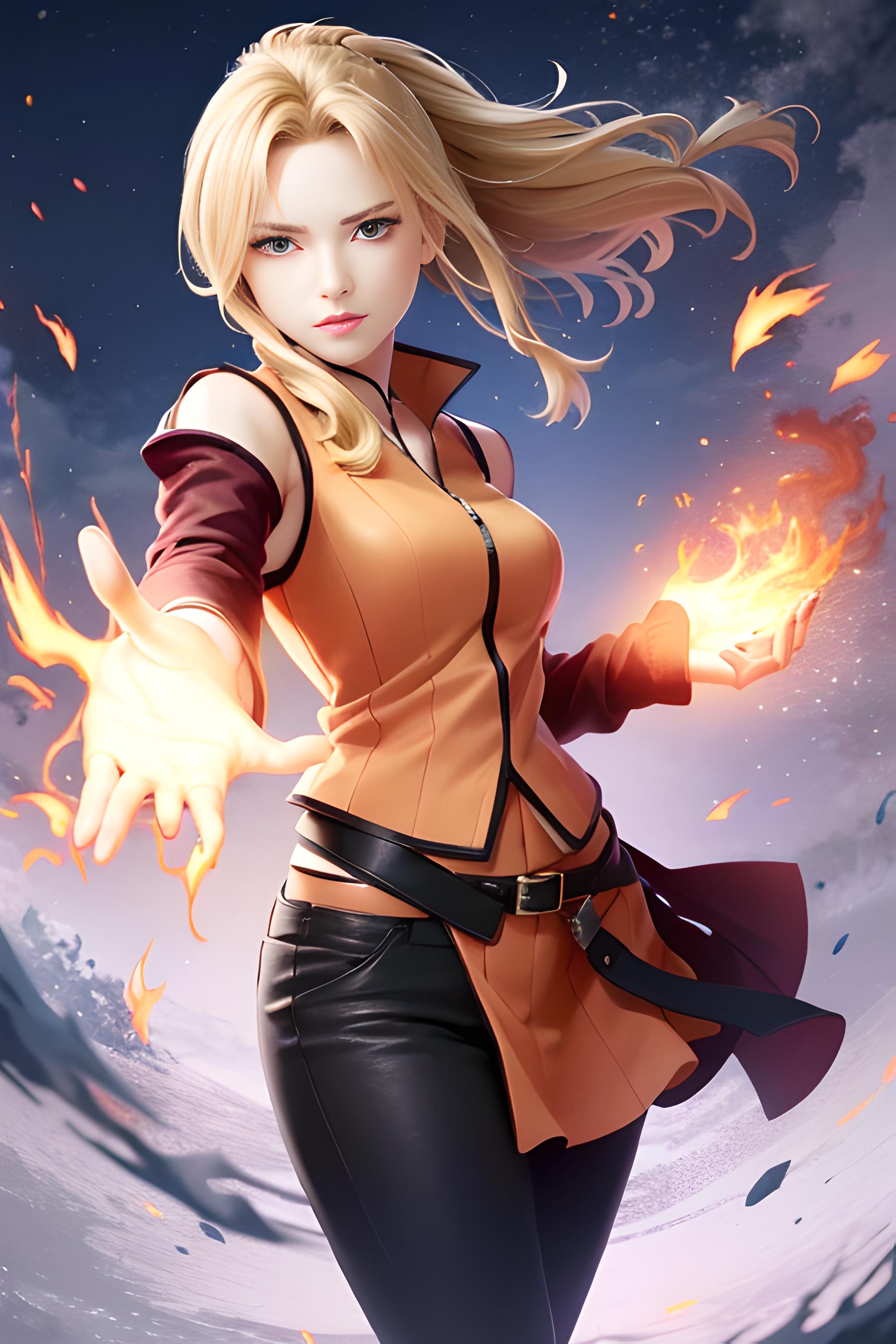 orange jacket, detached sleeves, orange skirt, belt, leggings, boots