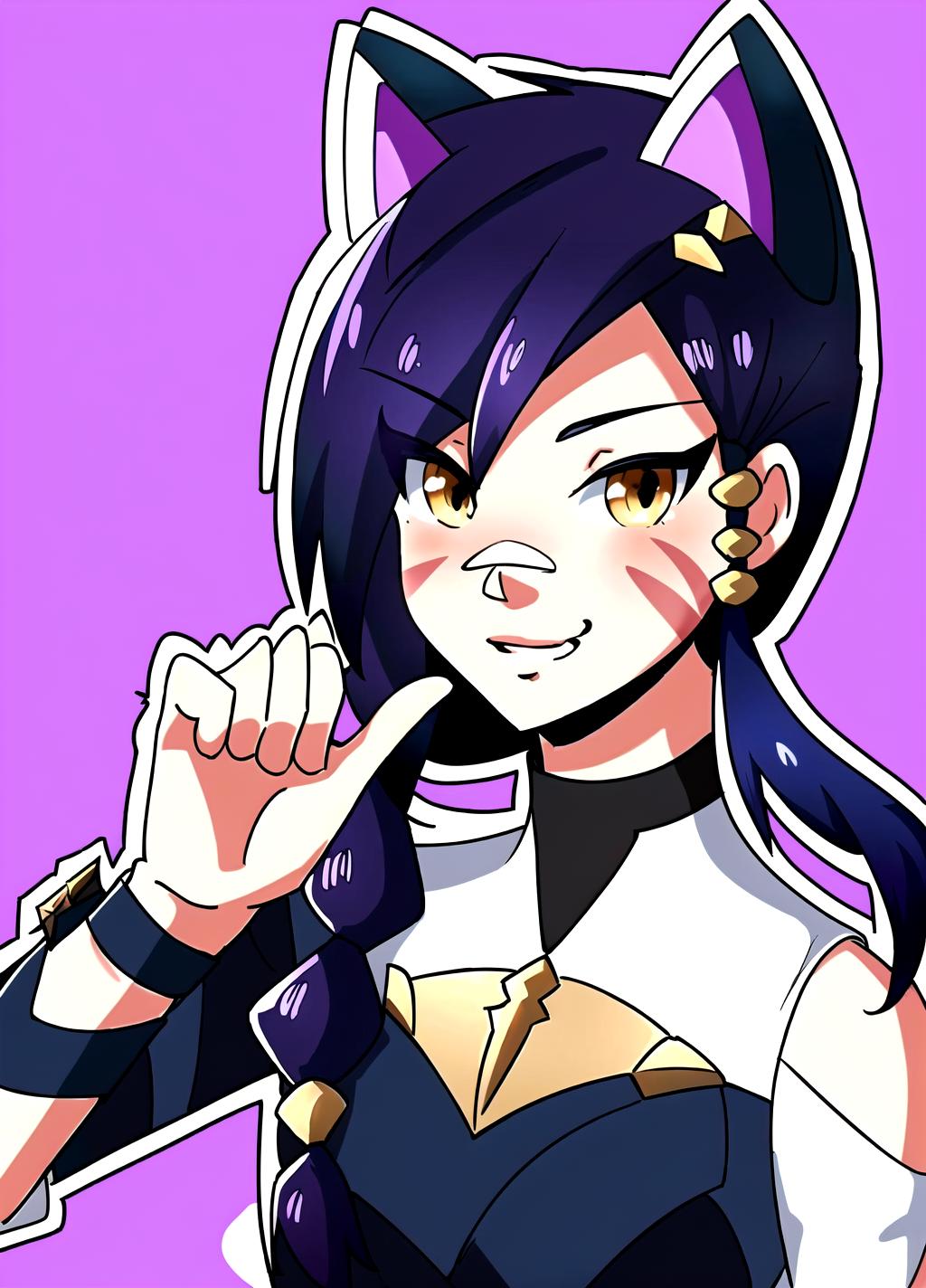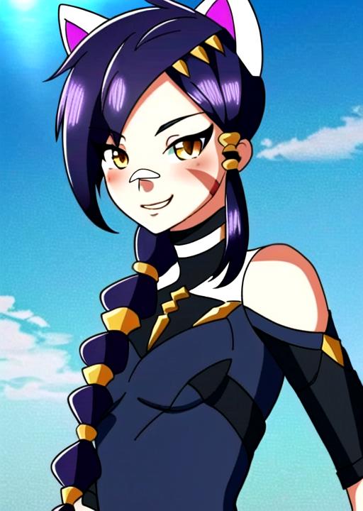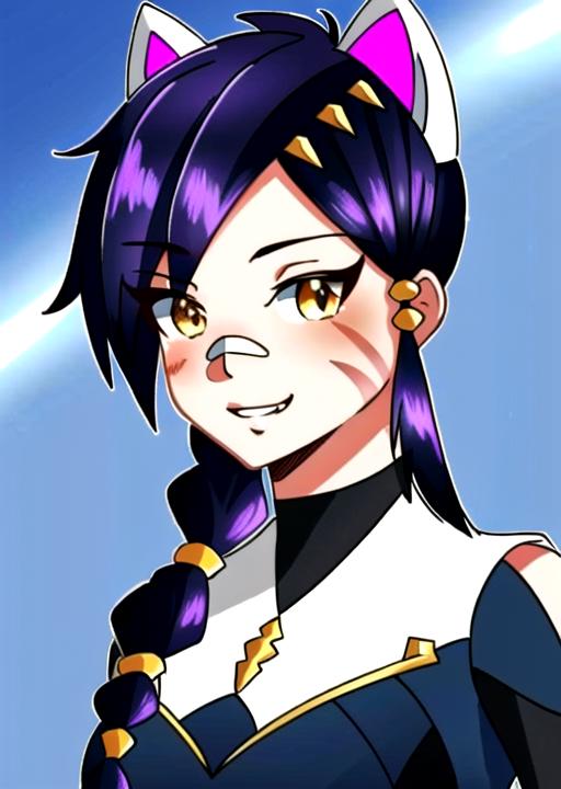 1girl, solo, long hair, looking at viewer, black hair, bandaid on face, yellow eyes, animal ears, smile, bandaid on nose, braid, cat ears, bandaid, ,bodysuit, gloves, teeth, scarf, blush, hair ornament, purple hair, fingerless gloves, facial mark, orange eyes, jewelry,