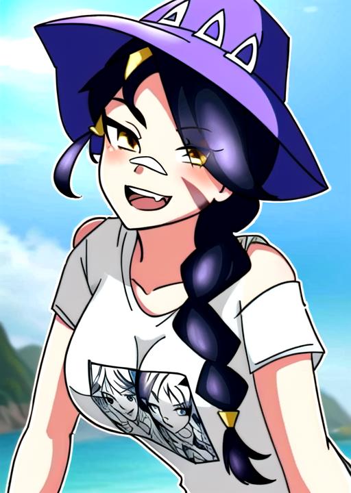 1girl, solo, long hair, looking at viewer, black hair, bandaid on face, yellow eyes, smile, bandaid on nose, braid, bandaid, bangs, breasts, open mouth, fang, bare shoulders, scar, teeth, shirt, bare shoulders, white shirt, short sleeves, closed mouth, t-shirt, hair over one eye, portrait, hair over shoulder, shorts,sandals, breast,hat,