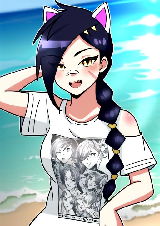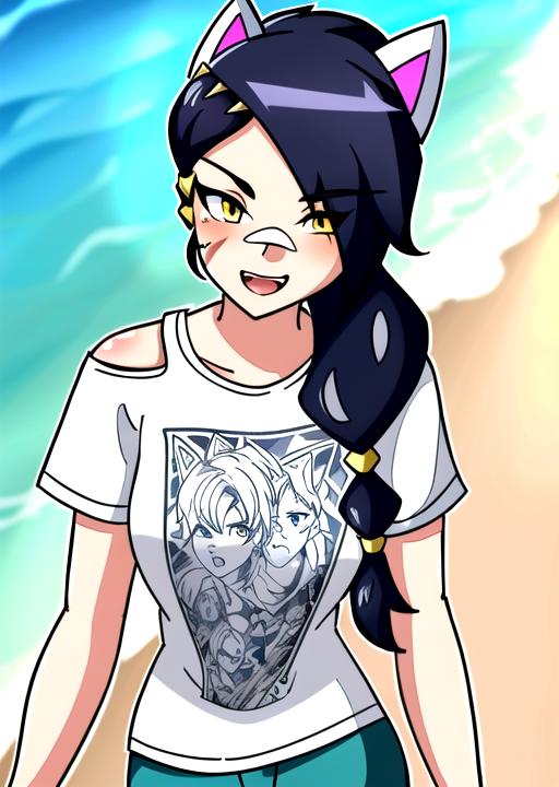 1girl, solo, long hair, looking at viewer, black hair, bandaid on face, yellow eyes, animal ears, smile, bandaid on nose, braid, cat ears, bandaid, bangs, breasts, fake animal ears, simple background, open mouth, fang, , bare shoulders, scar, teeth, shirt, bare shoulders, white shirt, short sleeves, closed mouth, t-shirt, hair over one eye, portrait, bag, hair over shoulder, shorts,hat