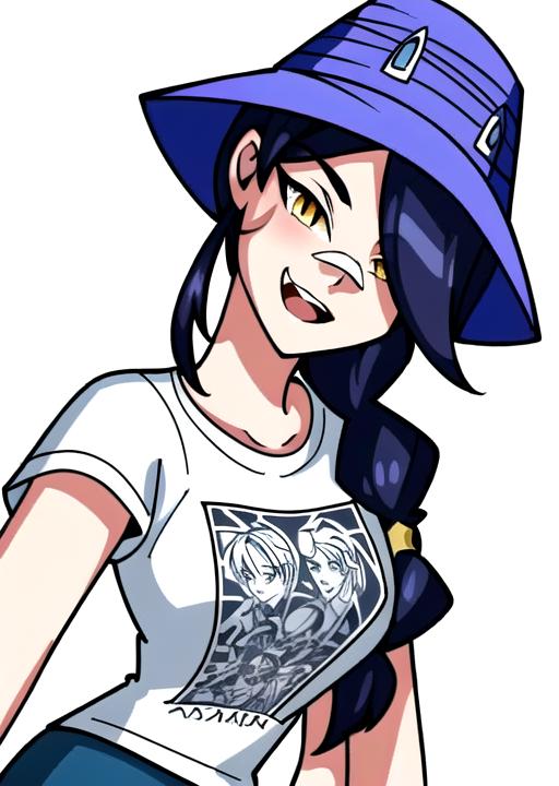 1girl, solo, long hair, looking at viewer, black hair, bandaid on face, yellow eyes, smile, bandaid on nose, braid, bandaid, bangs, ???????, open mouth, fang, ???? shoulders, scar, teeth, shirt, ???? shoulders, white shirt, short sleeves, closed mouth, t-shirt, hair over one eye, portrait, hair over shoulder, shorts,sandals, breast,hat,