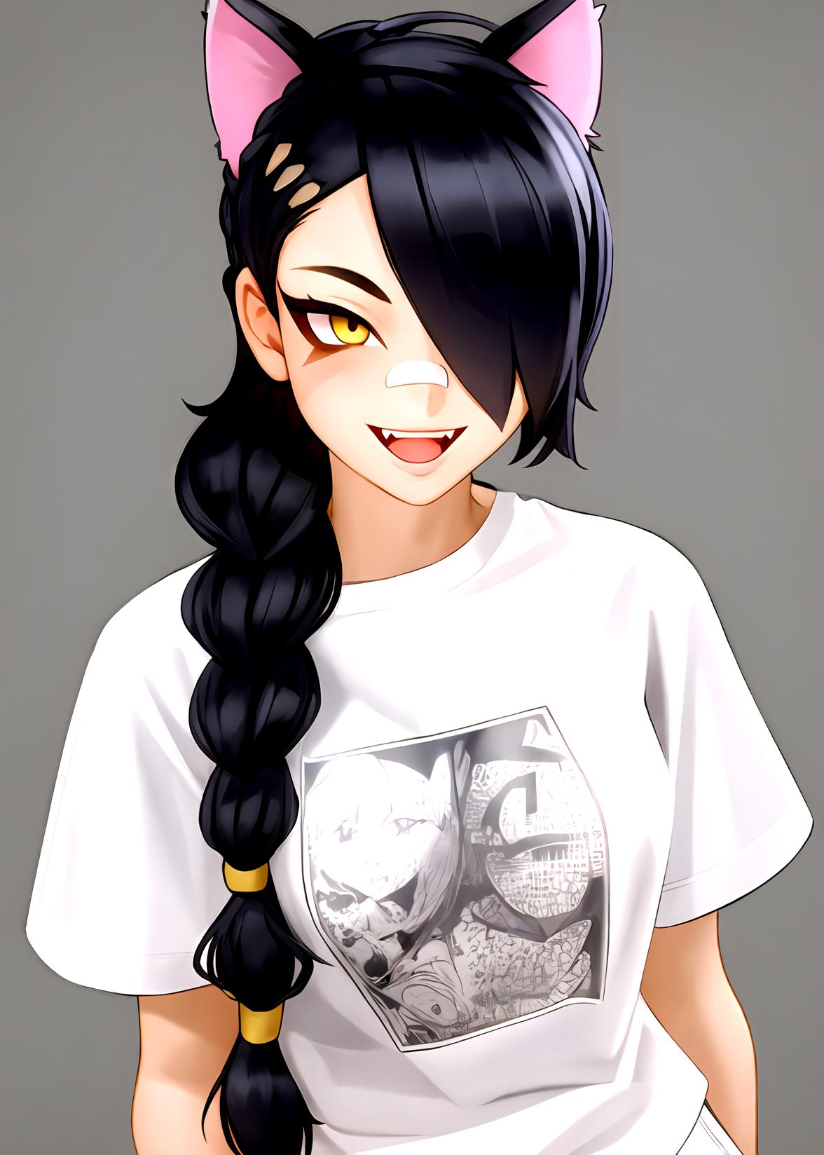 1girl, solo, long hair, looking at viewer, black hair, bandaid on face, yellow eyes, animal ears, smile, bandaid on nose, braid, cat ears, bandaid, bangs, ???????, fake animal ears, simple background, open mouth, fang, , ???? shoulders, scar, teeth, shirt, ???? shoulders, white shirt, short sleeves, closed mouth, t-shirt, hair over one eye, portrait, bag, hair over shoulder, shorts,hat