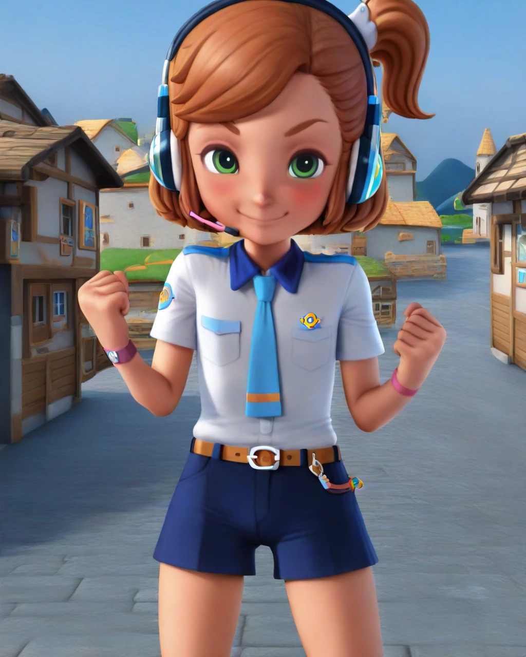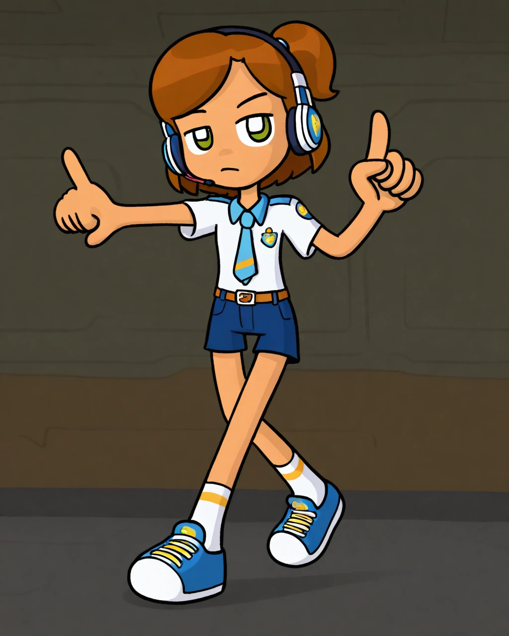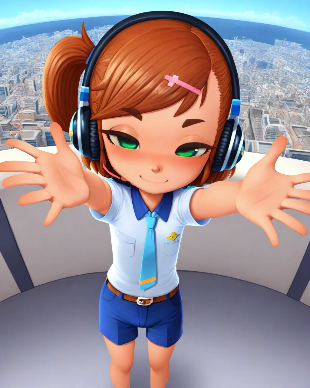 Use female child, swsky to summon her, use short hair, brown hair, side ponytail to form her head, use headphones to put on her headphones, use belt, shorts, shirt, necktie to summon her attire.