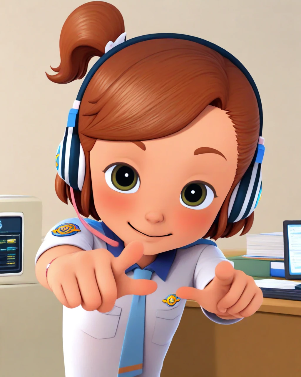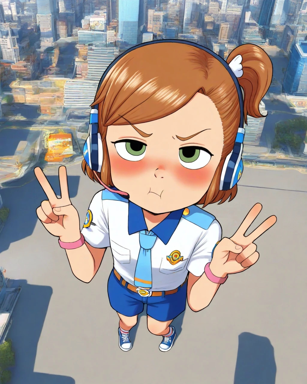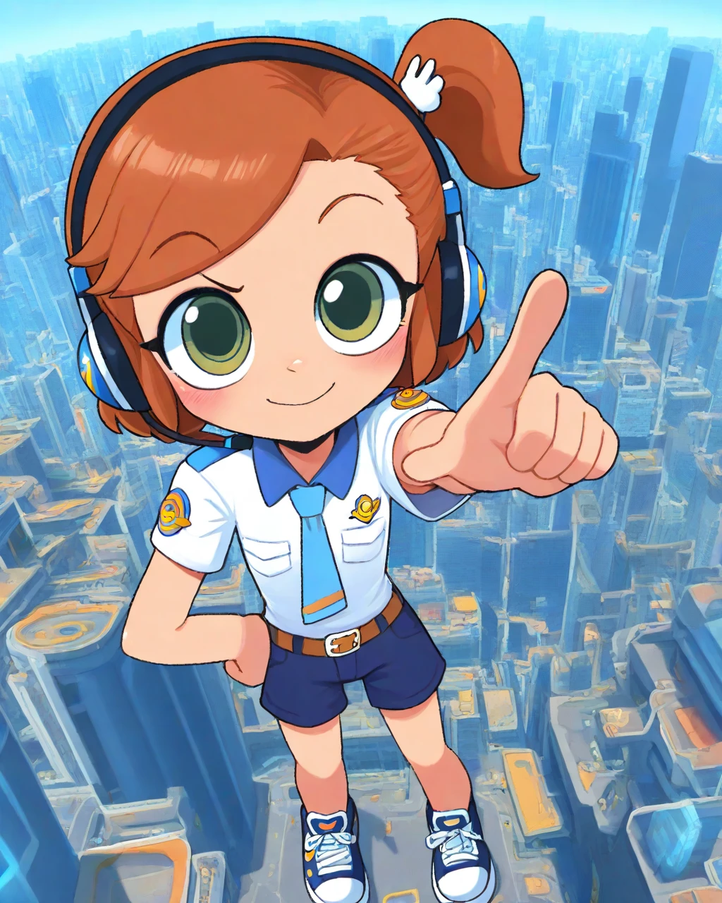 Use female child, swsky to summon her, use short hair, brown hair, side ponytail to form her head, use headphones to put on her headphones, use belt, shorts, shirt, necktie to summon her attire.