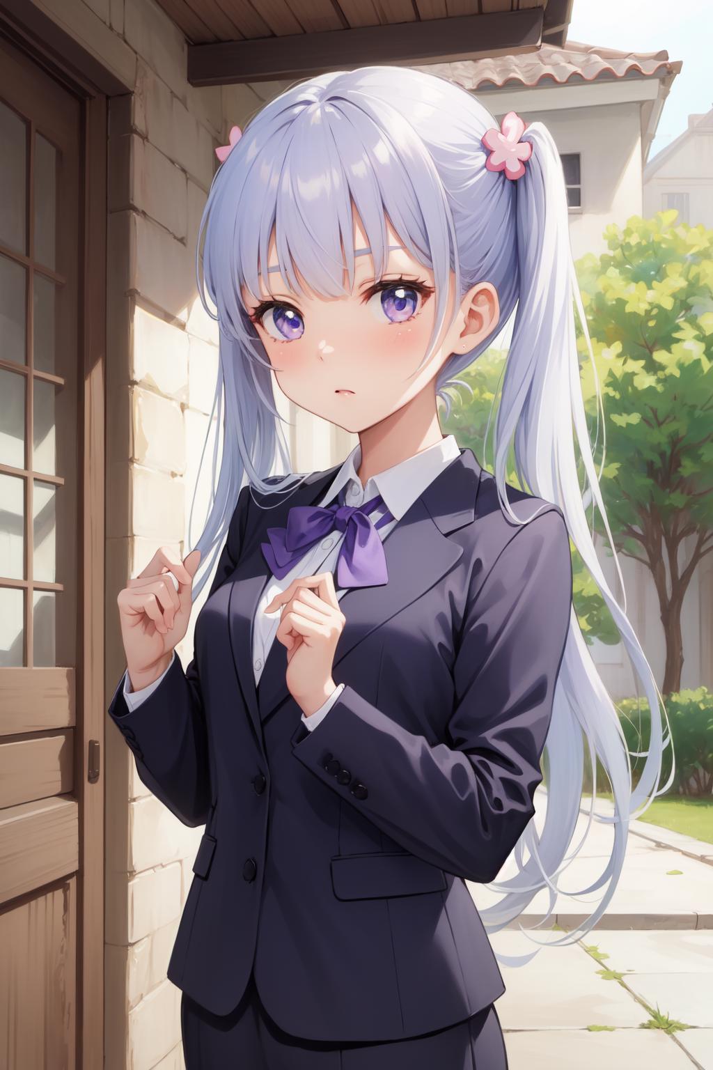 default: suzukaze aoba, 1girl, hair ornament, suit, twintails, bow, purple hair, purple bow