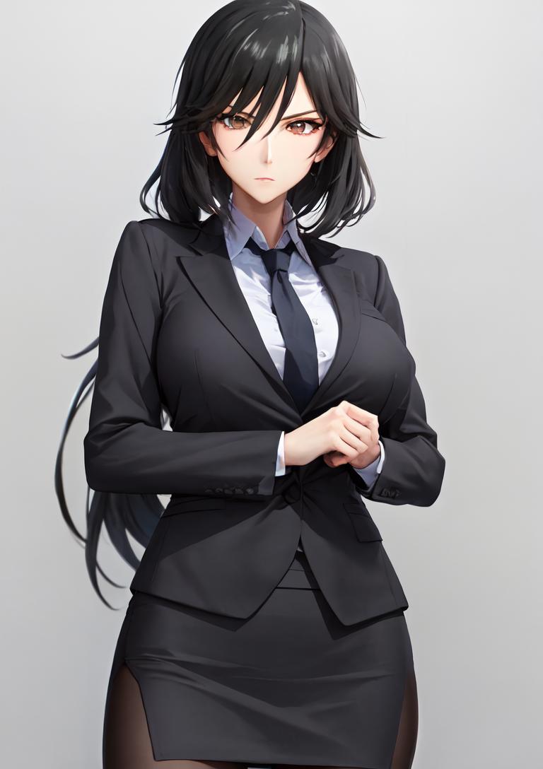 formal, necktie, skirt suit, suit, jacket, shirt, pencil skirt, black pantyhose