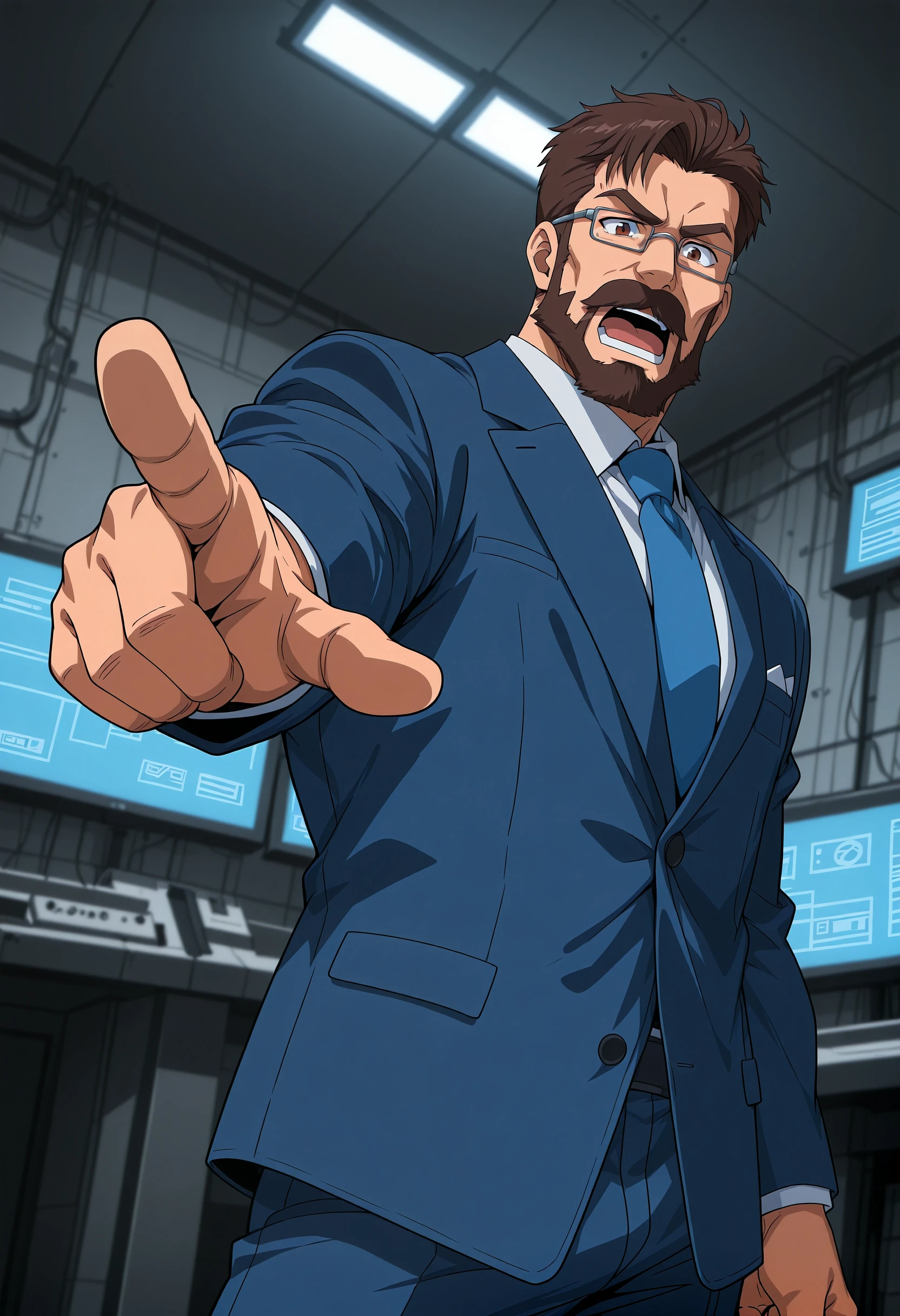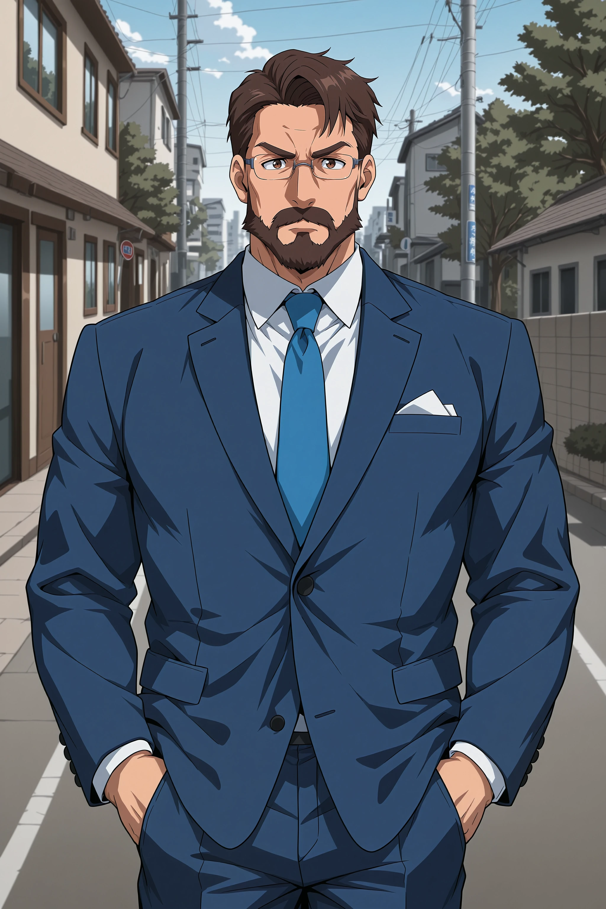 blue suit, blue necktie, glasses
