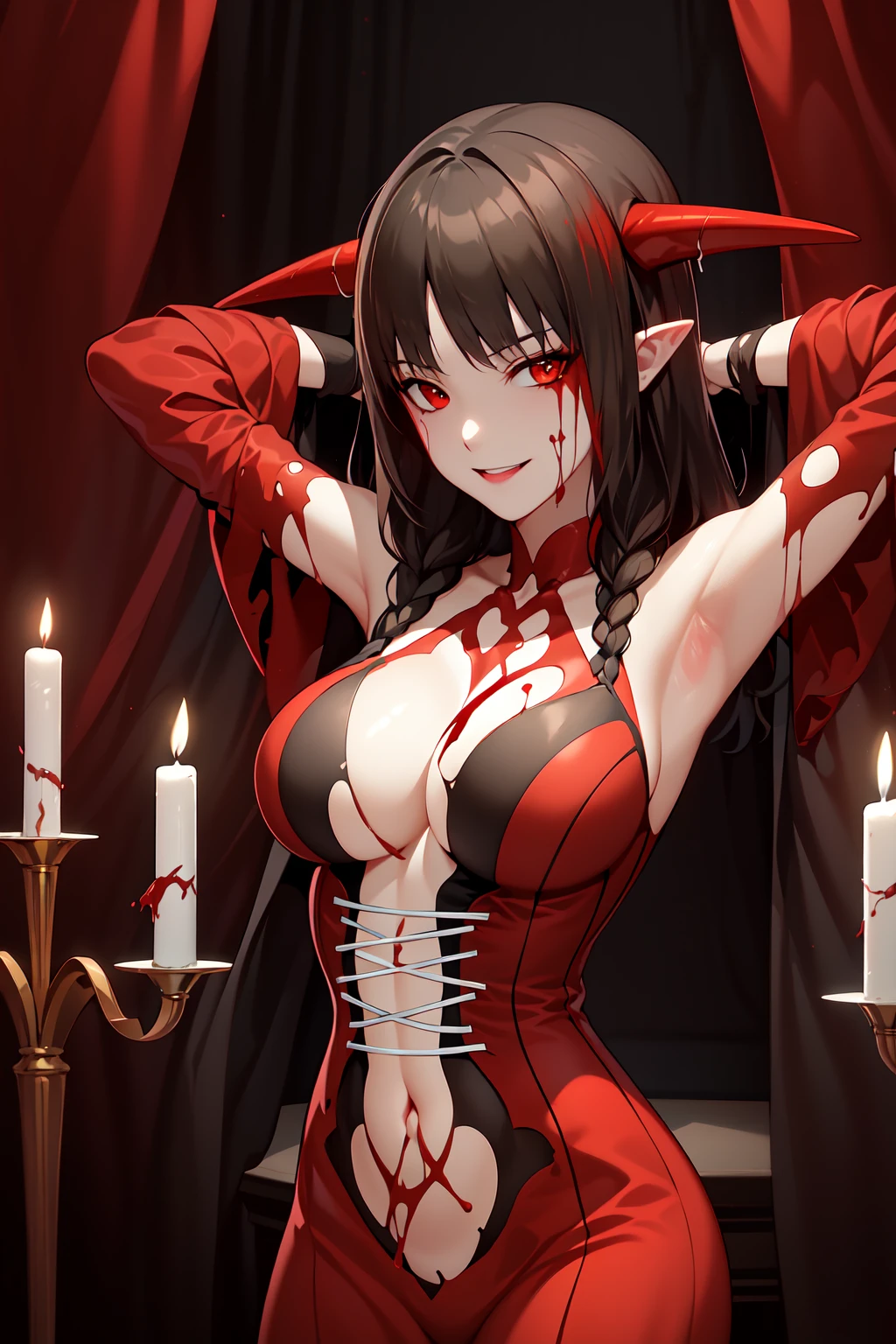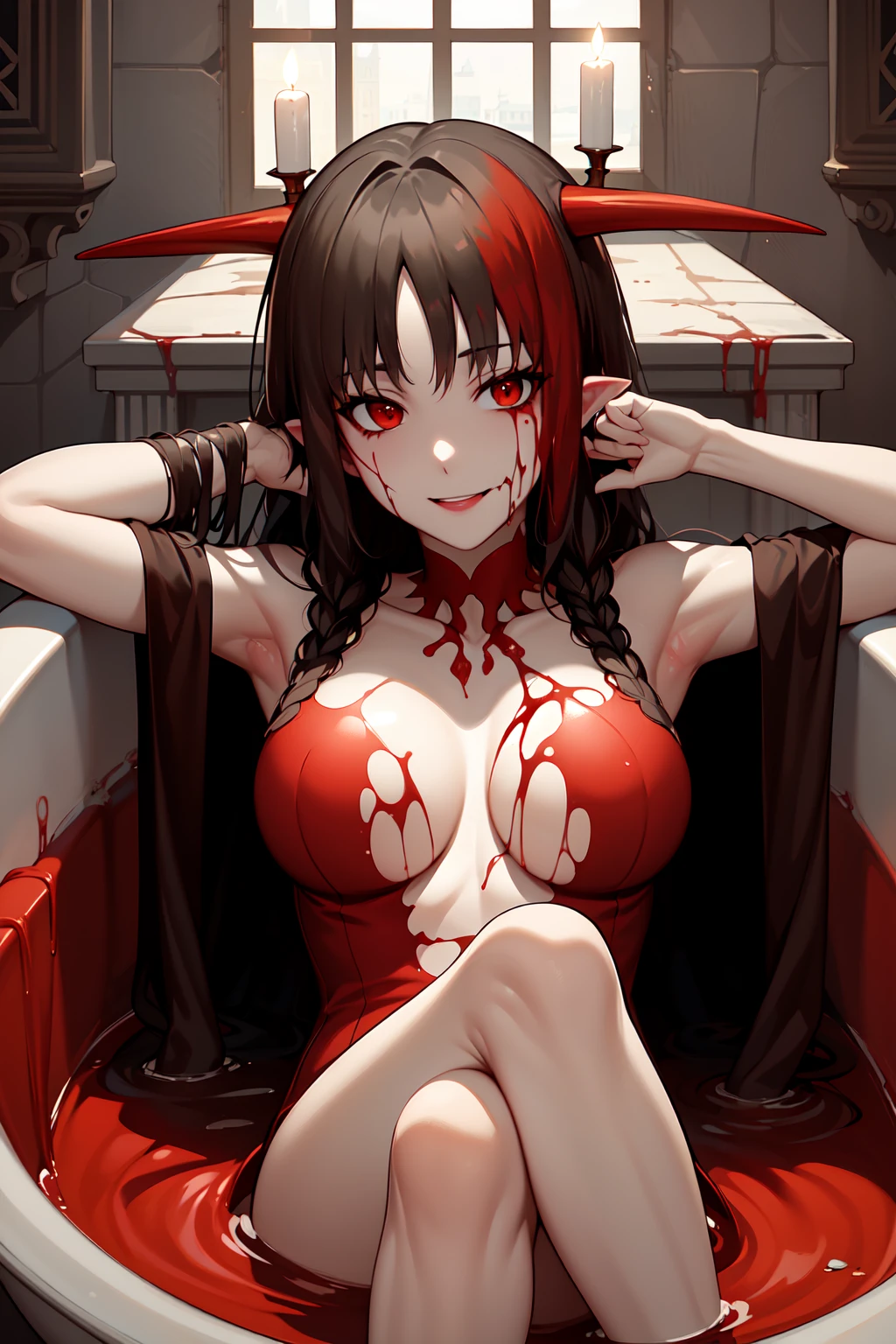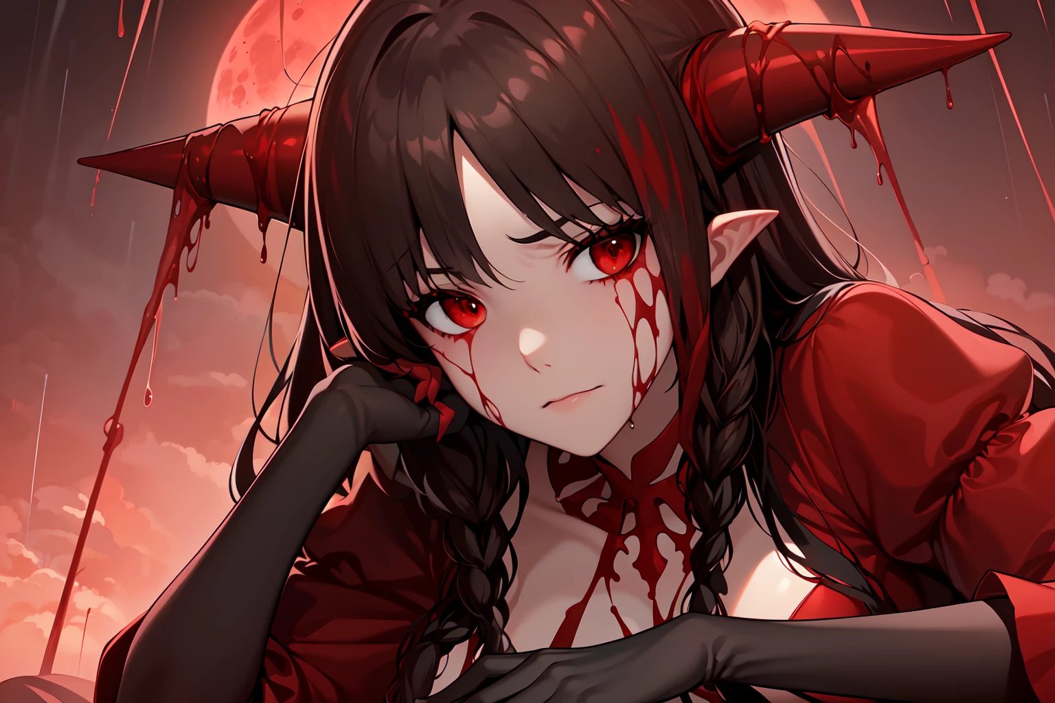 To prompt this character, enter "<lora:Bloodessv3:strength>Bloodless, bloody gown, horns, black gloves,". Additionally, to prompt her holding her parasol, prompt "holding parasol".