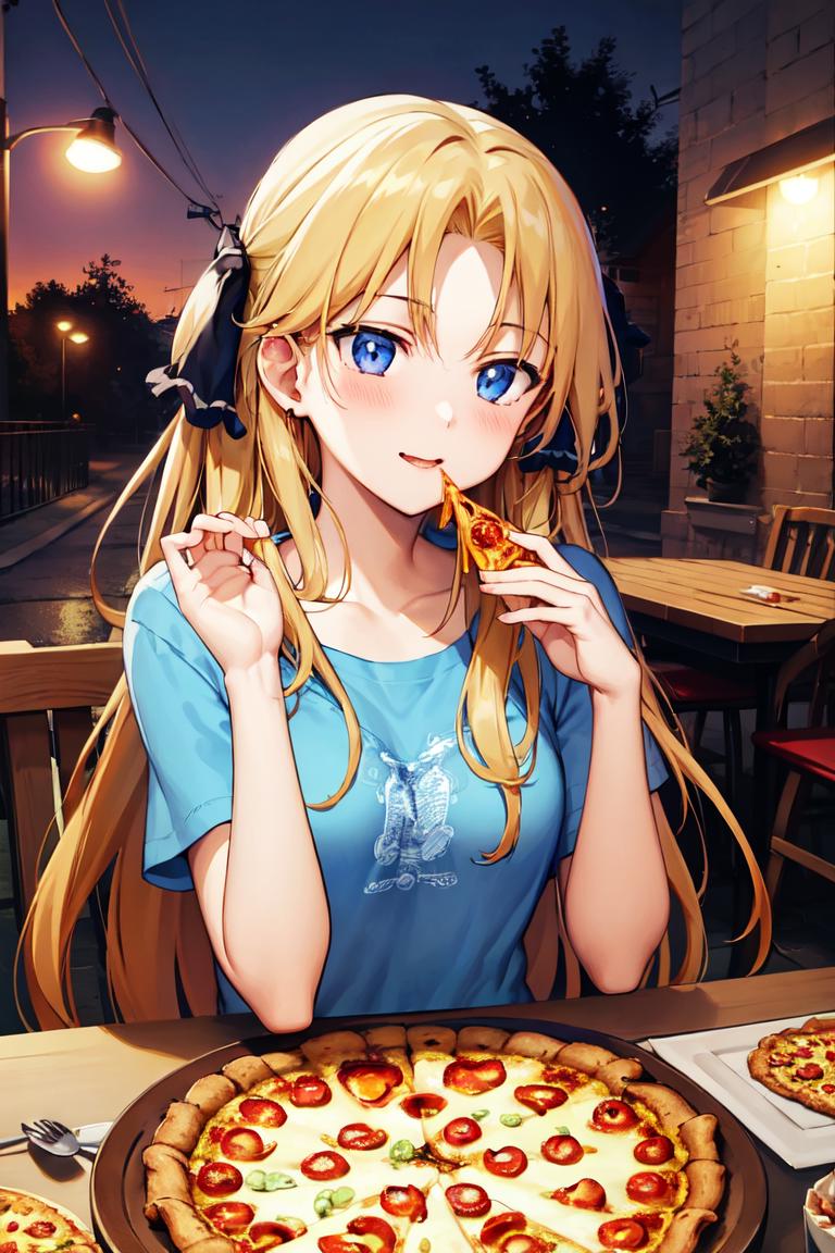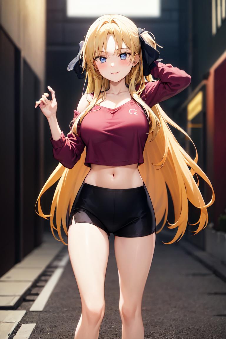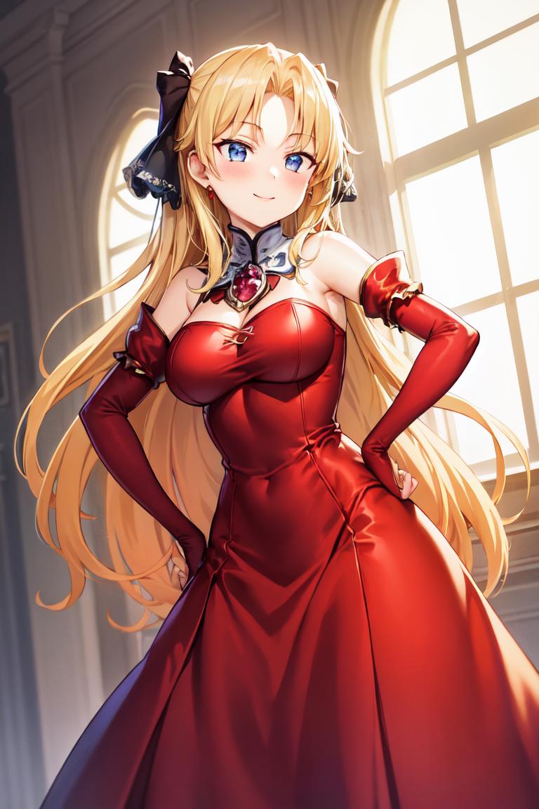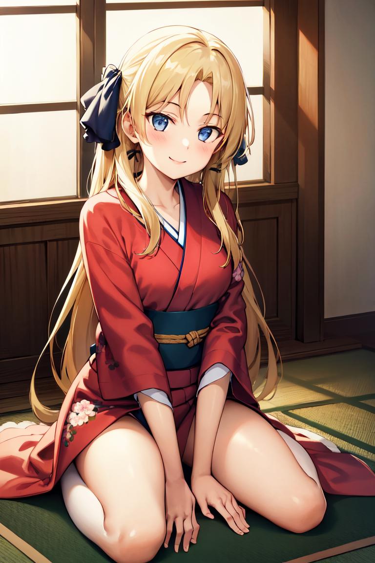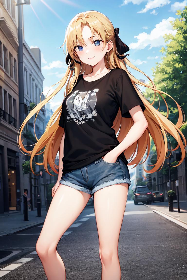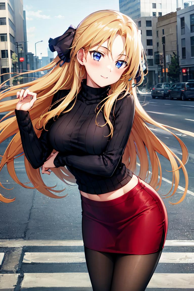 Use "long hair, hair ribbon" for her hairstyle.