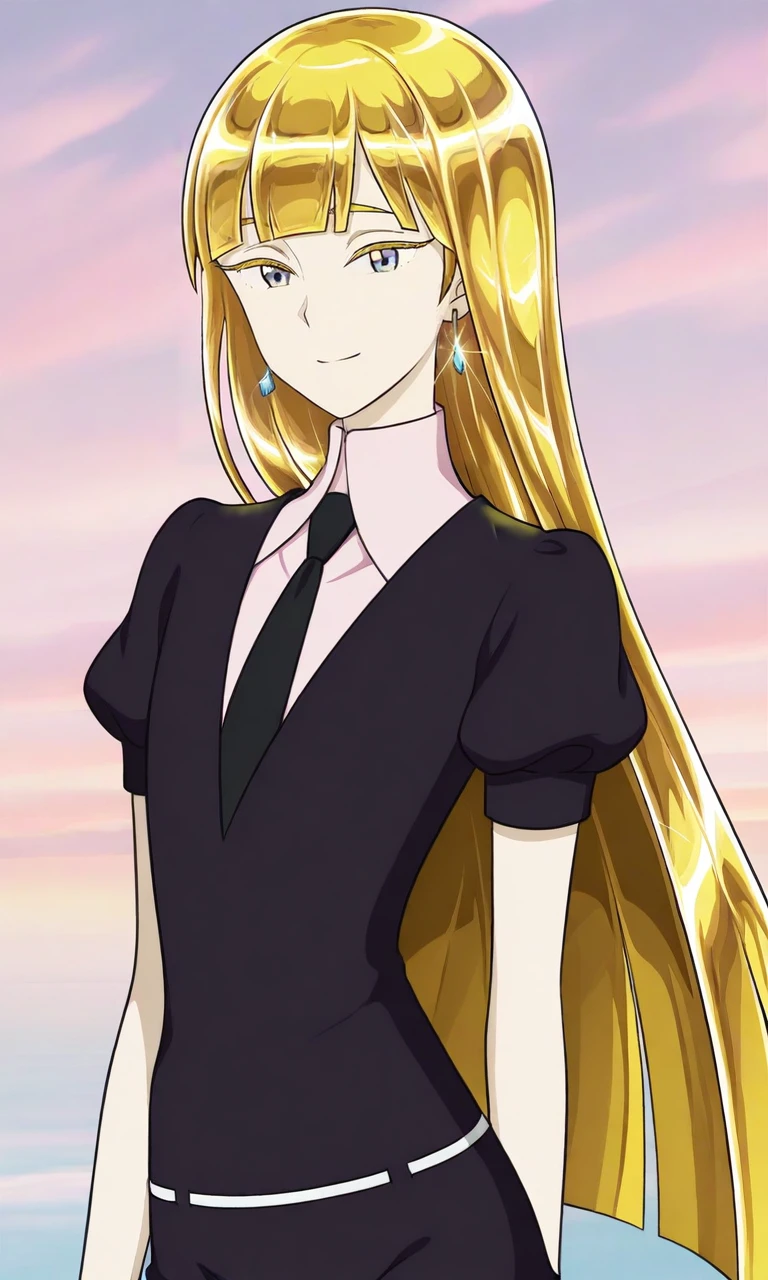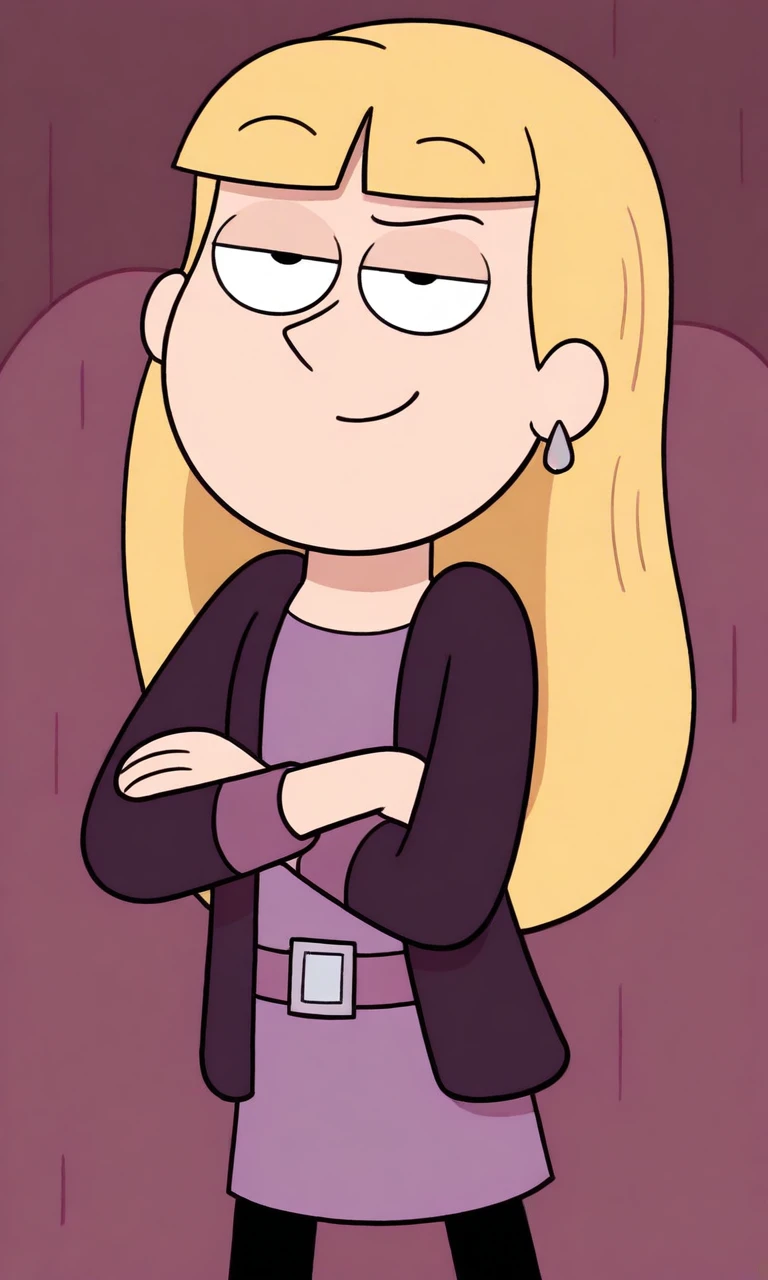 1girl, long hair, blonde hair, blunt bangs, blue eyes, earrings, purple jacket, purple dress, purple belt, black pantyhose, long sleeves