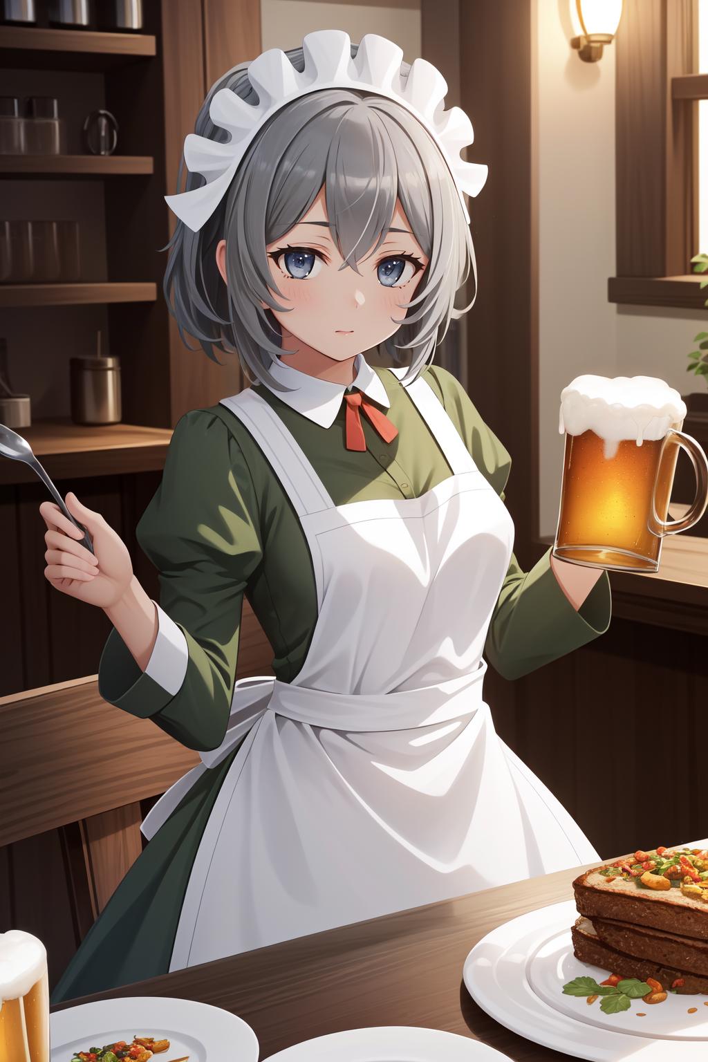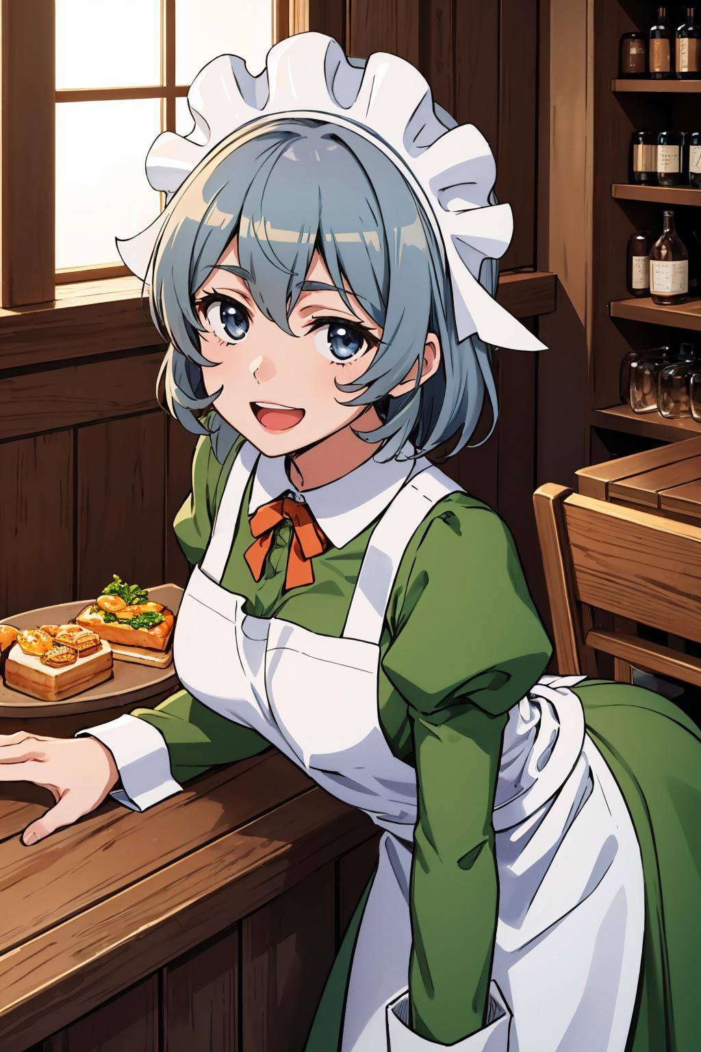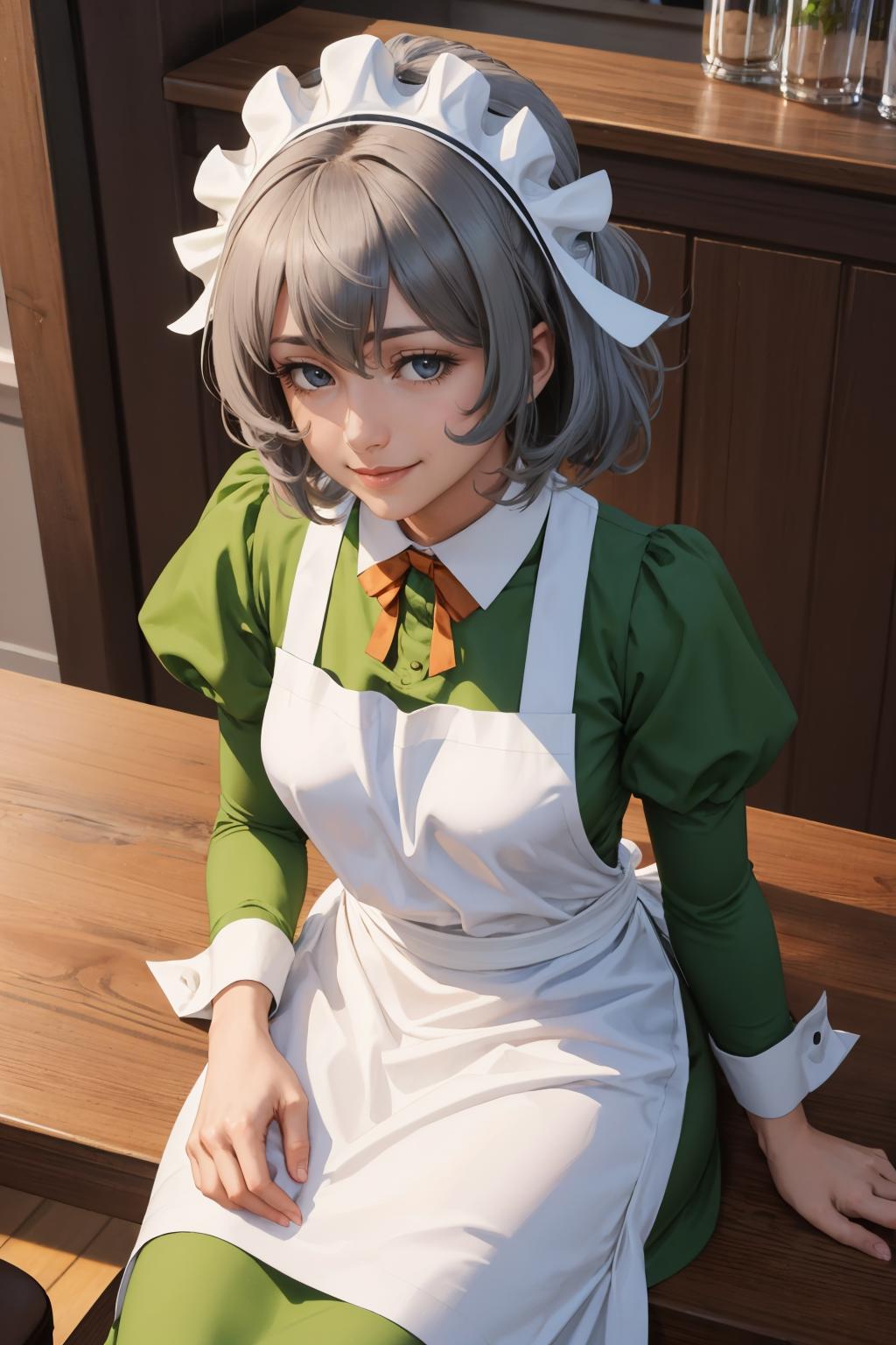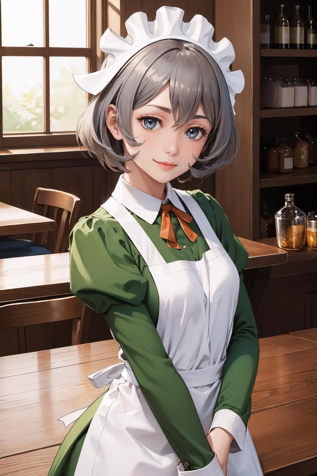 Add "maid headdress, green dress, apron" for her typical look.