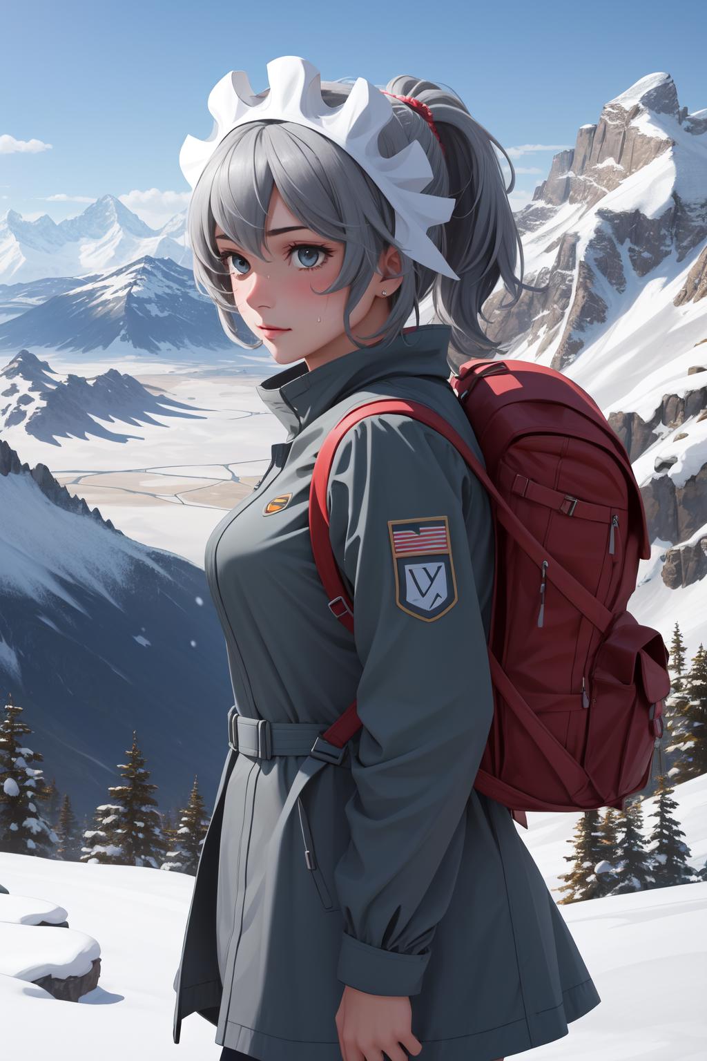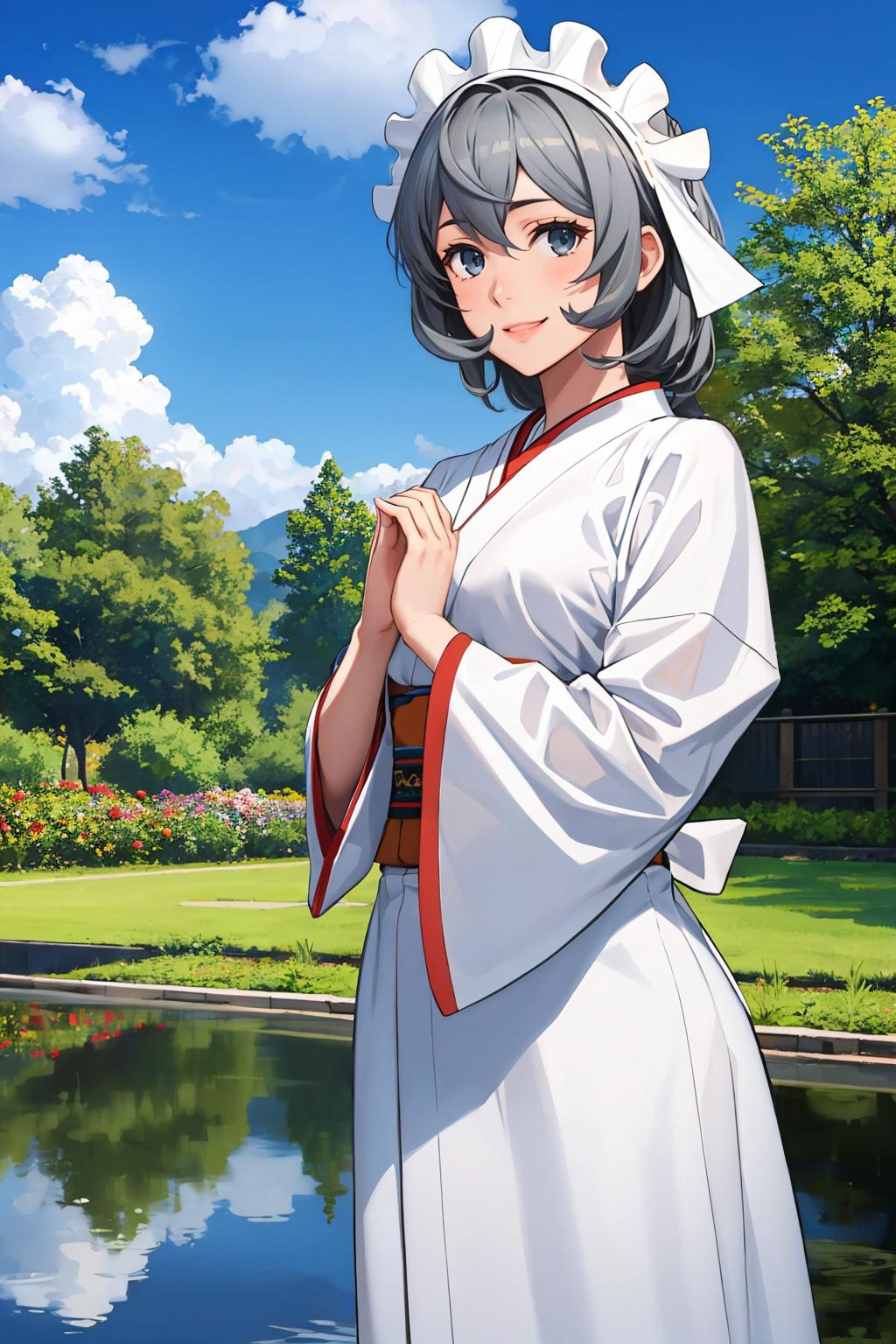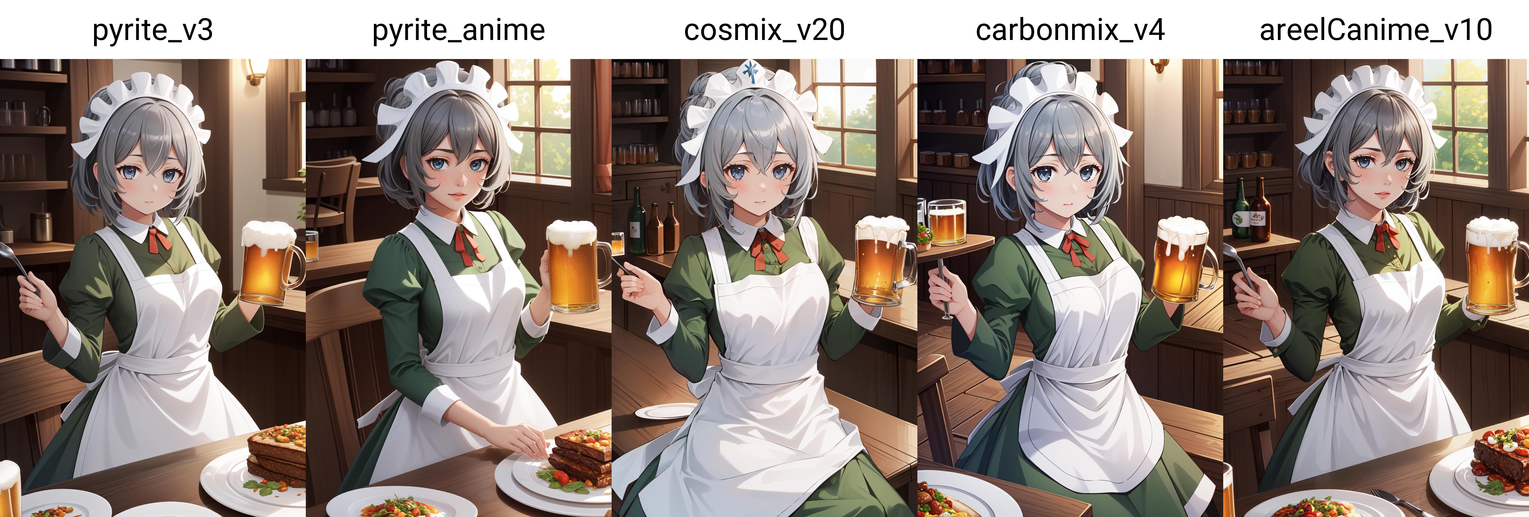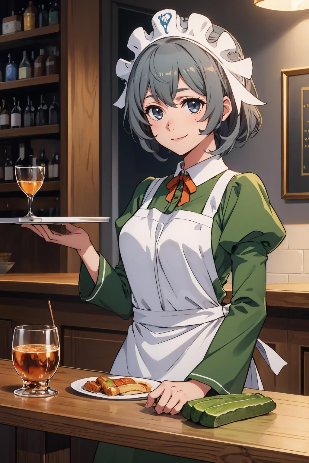 Add "maid headdress, green dress, apron" for her typical look.