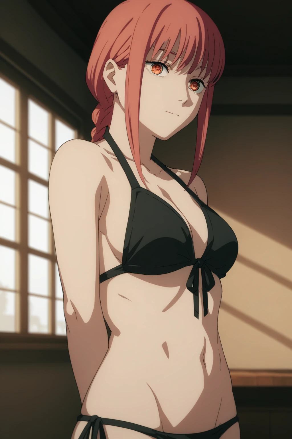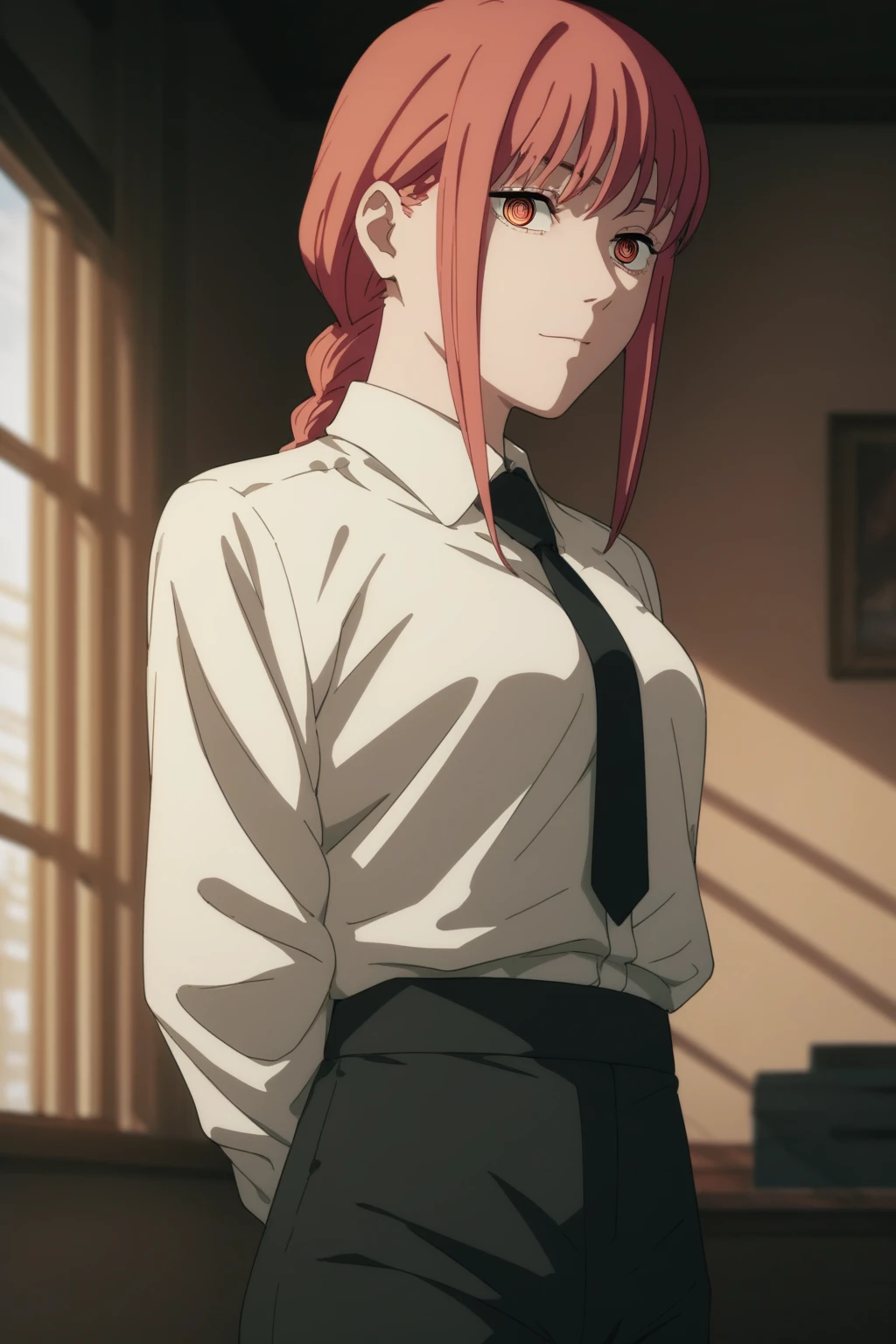 makima_v1, 1girl, red hair, ringed eyes, braided ponytail, solo, black necktie, shirt, collared shirt, black_pants,